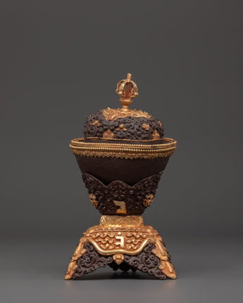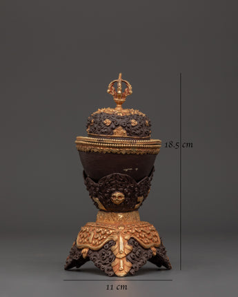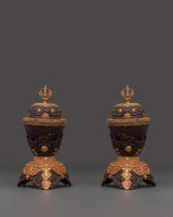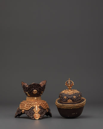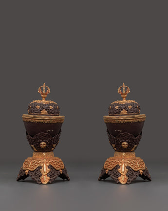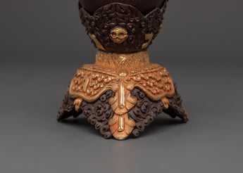 The Kapala set holds the nectar used in higher esoteric rituals. It offers liberation to gods and deities to ensure their devotion. The offerings are said to be transformed into the Wisdom Nectar, a liquid form of the deity's Enlightened Mind.