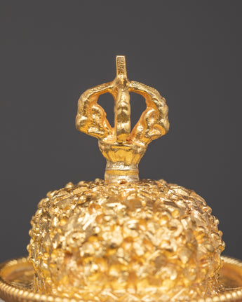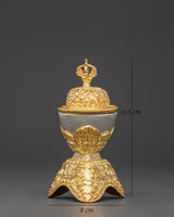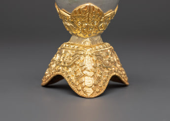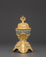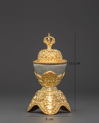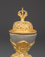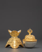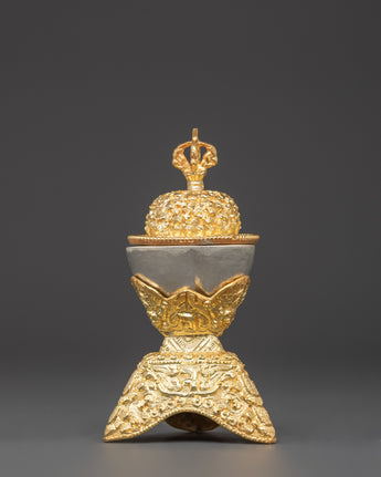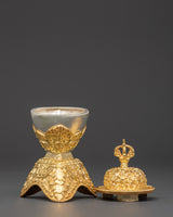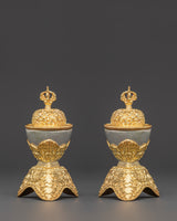 The Kapala set holds the nectar used in higher esoteric rituals. It offers liberation to gods and deities to ensure their devotion. The offerings are said to be transformed into the Wisdom Nectar, a liquid form of the deity's Enlightened Mind.