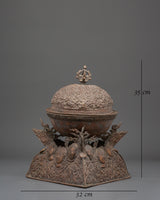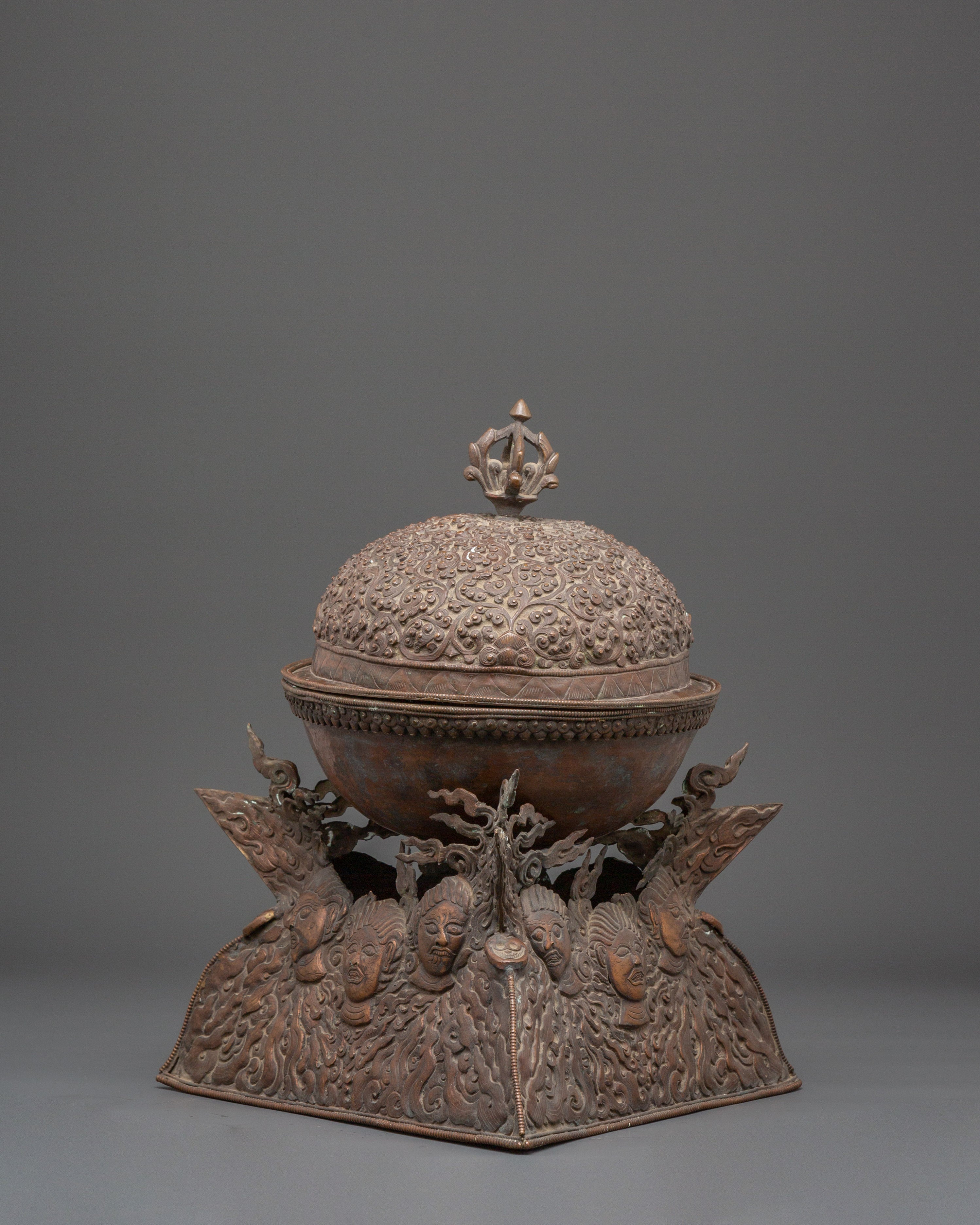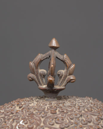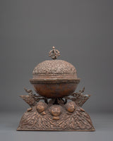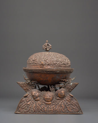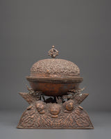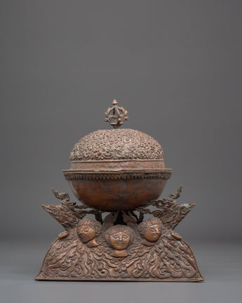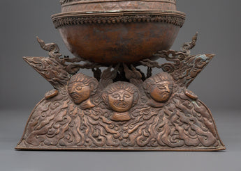 In Buddhist practice, the Kapala skull cup represents impermanence, devotion, and the offering of one’s ego to the divine. It is considered a sacred bridge between the material and spiritual realms, often used in Tantric meditation to cultivate wisdom and compassion. Whether placed in a personal shrine or used in ritual ceremonies, this copper ritual object carries both aesthetic beauty and deep spiritual meaning, making it a profound addition to your collection.