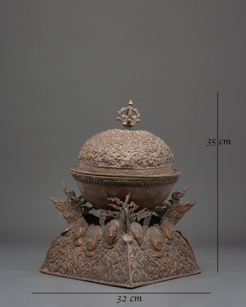 The Kapala set holds the nectar used in higher esoteric rituals. It offers liberation to gods and deities to ensure their devotion. The offerings are said to be transformed into the Wisdom Nectar, a liquid form of the deity's Enlightened Mind.