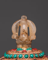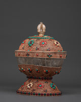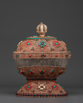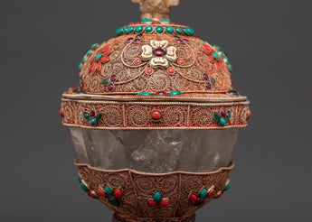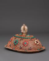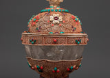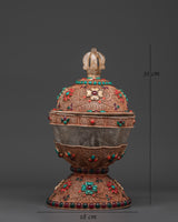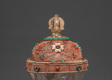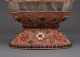 This colorful Kapala is crafted from copper and silver-plated materials and is embellished with vibrant artificial stones, including coral and turquoise. It combines traditional and spiritual themes. The crystal bowl in the center gives a touch of purity and is suitable for use in Buddhist rituals or as a sacred offering vessel. The rich textures of coral and turquoise stones, both of which are known for their spiritual characteristics, make this item more than simply a ceremonial tool; it's also a striking addition to any collection. Its exquisite design and symbolism are ideal for anyone seeking to deepen their meditation practice or introduce a meaningful piece of Himalayan heritage into their home.