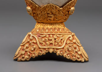 The elaborate details of this Kapala set emphasize the artistry and symbolic meaning of each item. It is both a useful ritual tool and a beautiful spiritual artifact because of the gold plating, which highlights the holy patterns and exquisite carvings. The Kapala is a potent tool for connecting practitioners with higher spiritual forces during meditation, pujas, or tantric ceremonies. It also serves as a reminder of mindfulness, transformation, and commitment.