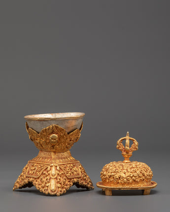 The Gold Plated Kapala Set is a sacred Tibetan ritual set crafted for spiritual offerings and ceremonial practices. Measuring 15 cm in height and 9.5 cm in width, this set is made from copper with silver plating and finished in gold plating, creating a visually stunning and spiritually meaningful piece. The Kapala, or ritual skull cup, is traditionally used in Vajrayana Buddhist rituals to symbolize impermanence and the transformation of negative energies into wisdom and compassion.