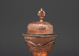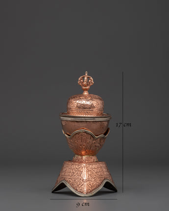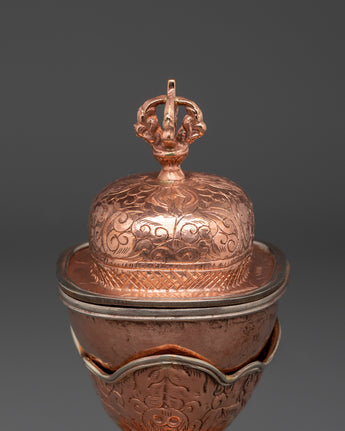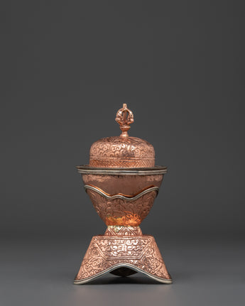 This handcrafted copper Kapala Ritual Skull Cup is a sacred Buddhist offering vessel that has traditionally been utilized in higher Tantric rites. This 17cm-tall Kapala is crafted from copper and adorned with intricate engravings. It has a wonderfully constructed lid and an intricately sculpted base. It is used as a ritual skull cup to make symbolic sacrifices during spiritual rites, reflecting the transformation of worldly attachments into enlightened awareness.