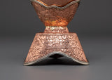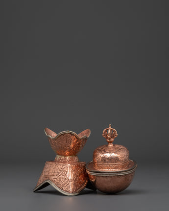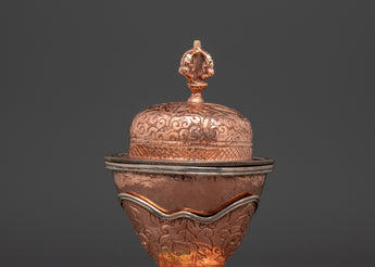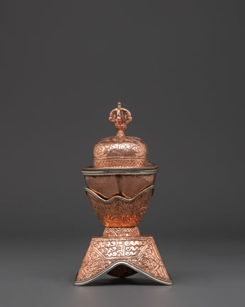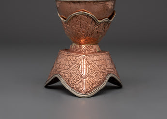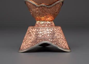 The Kapala's copper body is handcrafted and engraved with auspicious patterns, including traditional designs and symbolic motifs. Its sturdy design is reinforced by a raised platform, which not only adds safety but also emphasizes its ceremonial beauty. At approximately 0.26 kg, this artifact is ideal for altar settings, ritual use, or spiritual collections. The Kapala, revered in Himalayan and Vajrayana traditions, serves as both a powerful ritual tool and a poignant reminder of impermanence, knowledge, and spiritual awakening.