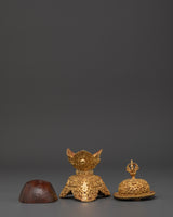 This handcrafted ritual Kapala set is utilized in Tantric Buddhist ceremonies as offerings to wrathful deities, representing the transformation of negative energy into knowledge. This stunning Kapala Set comprises two finely handcrafted Tibetan ritual skull cups, each measuring 15.5 cm in height and 9.5 cm in width. These beautiful copper cups, weighing 0.37 kg each, feature delicate gold plating. The exquisitely crafted vajra lids represent indestructible clarity and spiritual force, while the intricate design emphasizes the rich symbolism of Tibetan Buddhist rituals.