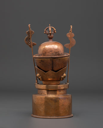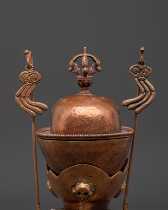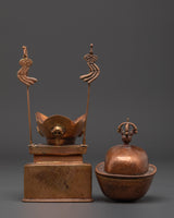 The Kapala set holds the nectar used in higher esoteric rituals. It offers liberation to gods and deities to ensure their devotion. The offerings are said to be transformed into the Wisdom Nectar, a liquid form of the deity's Enlightened Mind.