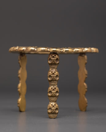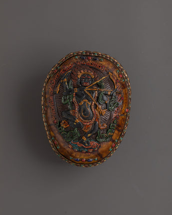 This handcrafted Tibetan Kapala, a sacred ceremonial object historically employed in advanced Vajrayana Buddhist practices, will allow you to experience the profound spirit of Tibetan tantric ritual. This item weighs 0.70 kg and has dimensions of 13.5 cm in height by 13.5 cm in breadth and 17.5 cm on each side. This Kapala (skull cup), exquisitely supported by a brass stand and intricately crafted from resin, copper, and silver plating, is a remarkable spiritual relic that embodies the esoteric depth of Tibetan Buddhism, in addition to serving as a symbolic offering vessel.