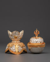 The Kapala set holds the nectar used in higher esoteric rituals. It offers liberation to gods and deities to ensure their devotion. The offerings are said to be transformed into the Wisdom Nectar, a liquid form of the deity's Enlightened Mind.