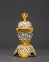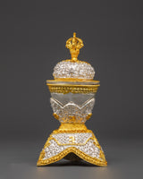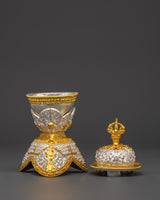 The Kapala set holds the nectar used in higher esoteric rituals. It offers liberation to gods and deities, ensuring their devotion. The offerings are said to be transformed into the Wisdom Nectar, a liquid form of the deity's Enlightened Mind.