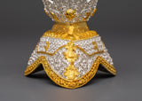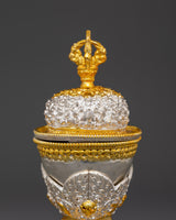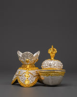 Each piece is made of copper and finished with electroplating in gold and silver. The cup is highly crafted and features a prominent Vajra lid, symbolizing the unbreakable spiritual force and the unification of method and wisdom. This kapala is both powerful and highly decorative, weighing 0.59 kilos per piece and 1.18 kilograms as a set. The elevated base enhances its presence and stability, making it suitable for ritual use or exhibition in a meditation or shrine environment.