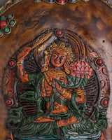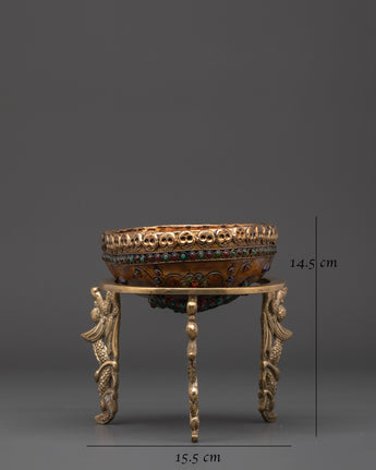Enhance your spiritual rituals with this exquisite Tibetan Kapala, a sacred offering bowl deeply rooted in Tantric Buddhist traditions. Measuring 19cm high, 14.5cm wide, and 15.5cm deep, and weighing 0.70kg, this copper kapala is both a powerful symbol and a stunning work of art. Hand-painted with vibrant acrylic colors and adorned with artificial turquoise and coral stones, it embodies the transformation of ignorance into wisdom.