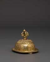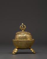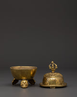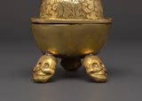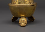 The Kapala, or ritual skull cup, is deeply important in Tibetan Buddhism and Tantric practices. This finely created brass Kapala is 11cm tall, 7.5cm broad, and weighs 0.44kg—ideal for personal altars and ceremonial usage. The cup features traditional engravings on its surface and is capped with a detailed vajra finial lid, representing unbreakable clarity and spiritual force. This Kapala, supported by a solid tripod base adorned with expressive skull motifs, serves as both an essential ritual tool and a striking spiritual treasure.