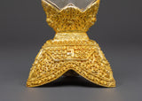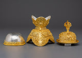 The Large Kapala Set for Altar is a magnificent ritual vessel used for advanced Vajrayana Buddhist and Tantric rites. This wonderfully carved copper Kapala, electro-plated in brilliant gold and silver, measures 19 cm tall and 10 cm broad and is a strong addition to any shrine or Dharma altar. It depicts the change of ego and mortality into enlightened understanding, which is a fundamental aspect of Tantric iconography.