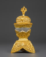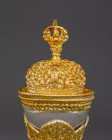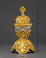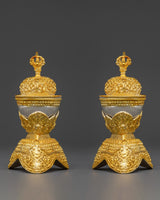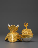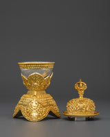 The Kapala set holds the nectar used in higher esoteric rituals. It offers liberation to gods and deities to ensure their devotion. The offerings are said to be transformed into the Wisdom Nectar, a liquid form of the deity's Enlightened Mind.