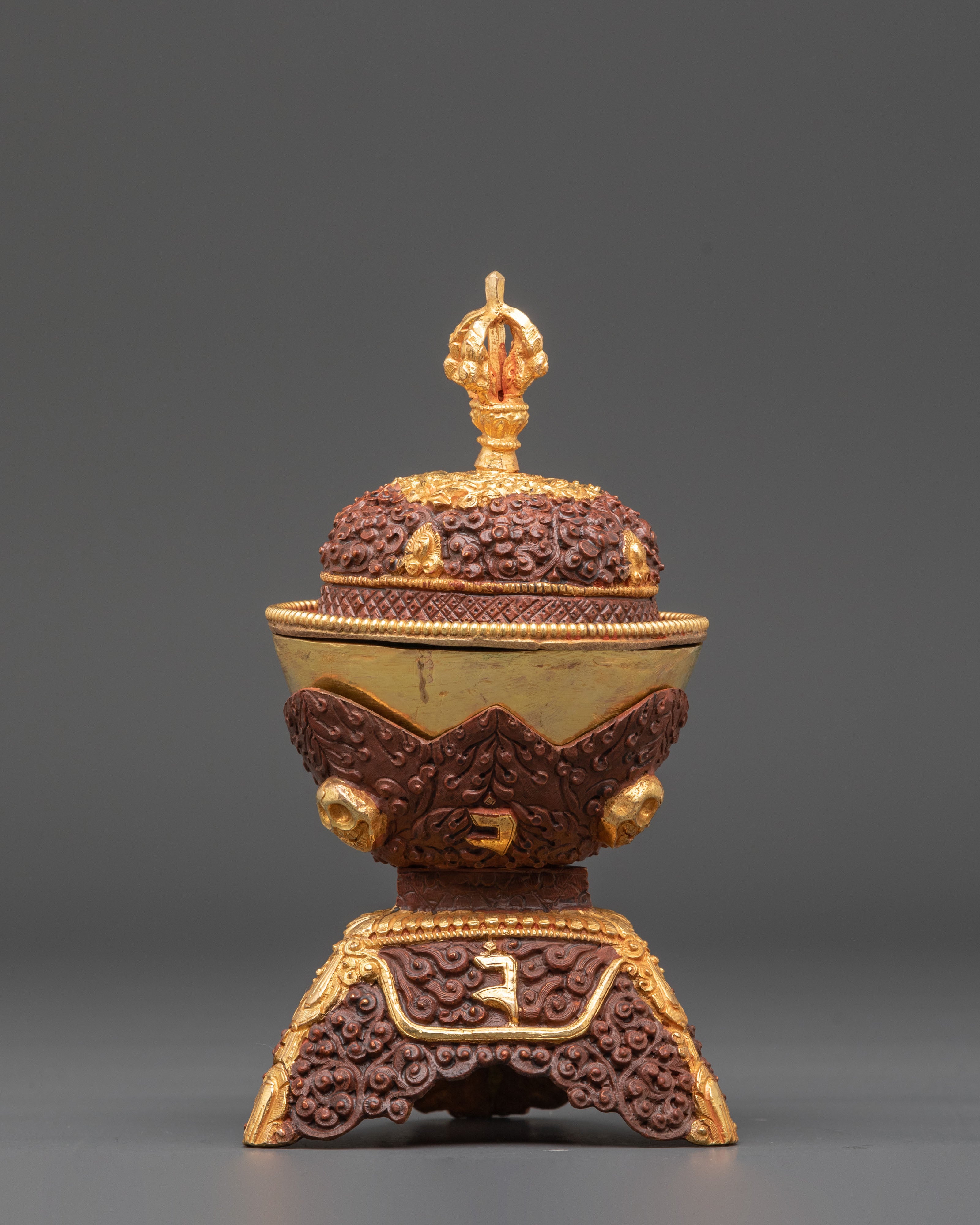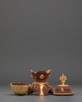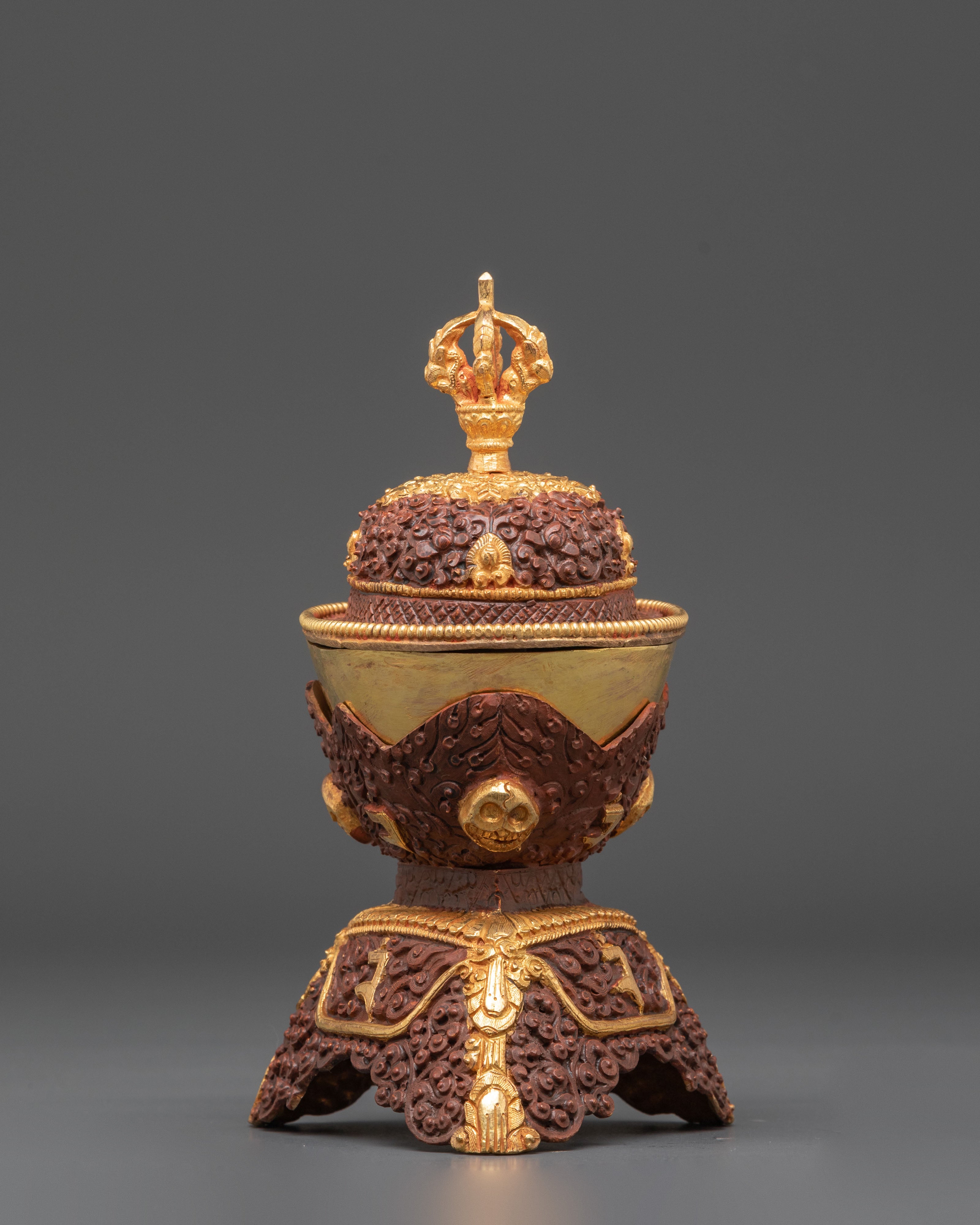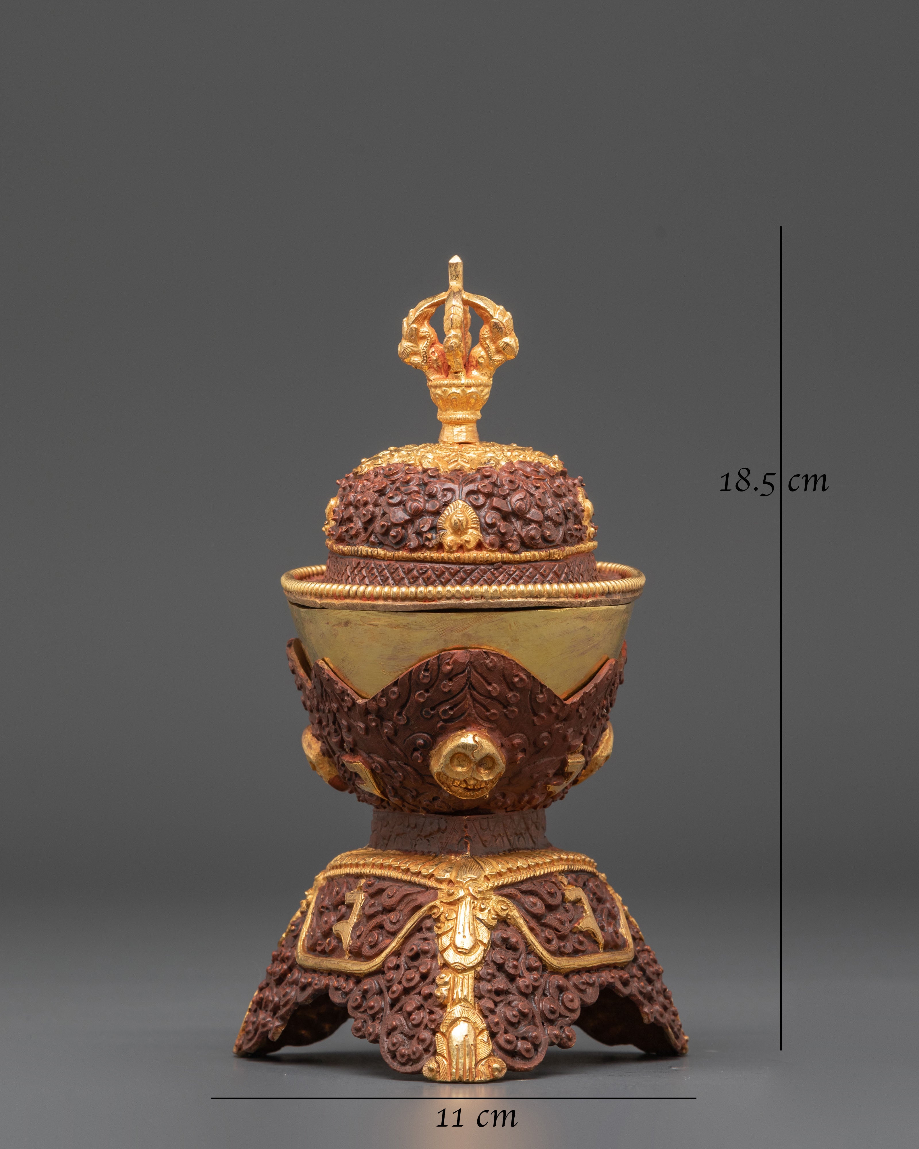 The Kapala set holds the nectar used in higher esoteric rituals. It offers liberation to gods and deities, ensuring their devotion. The offerings are said to be transformed into the Wisdom Nectar, a liquid form of the deity's Enlightened Mind.