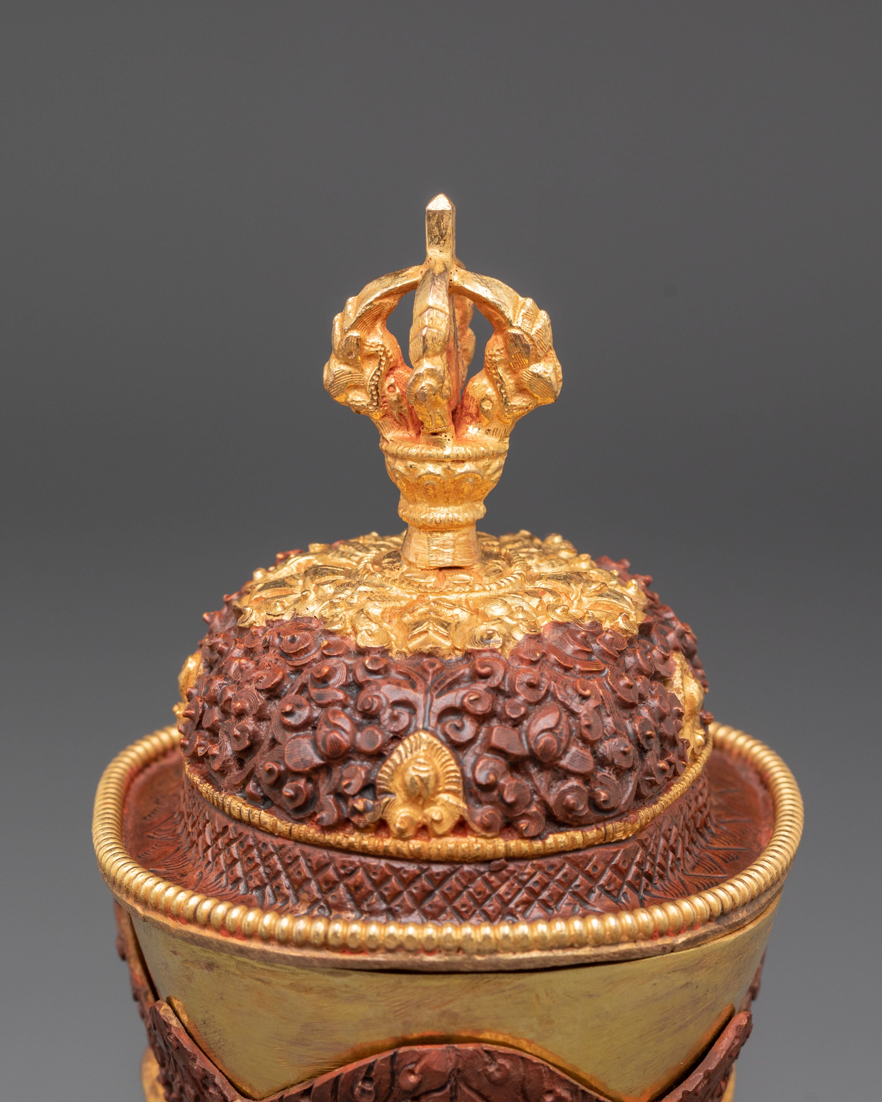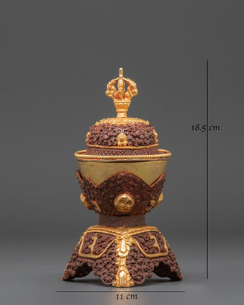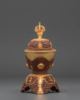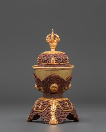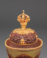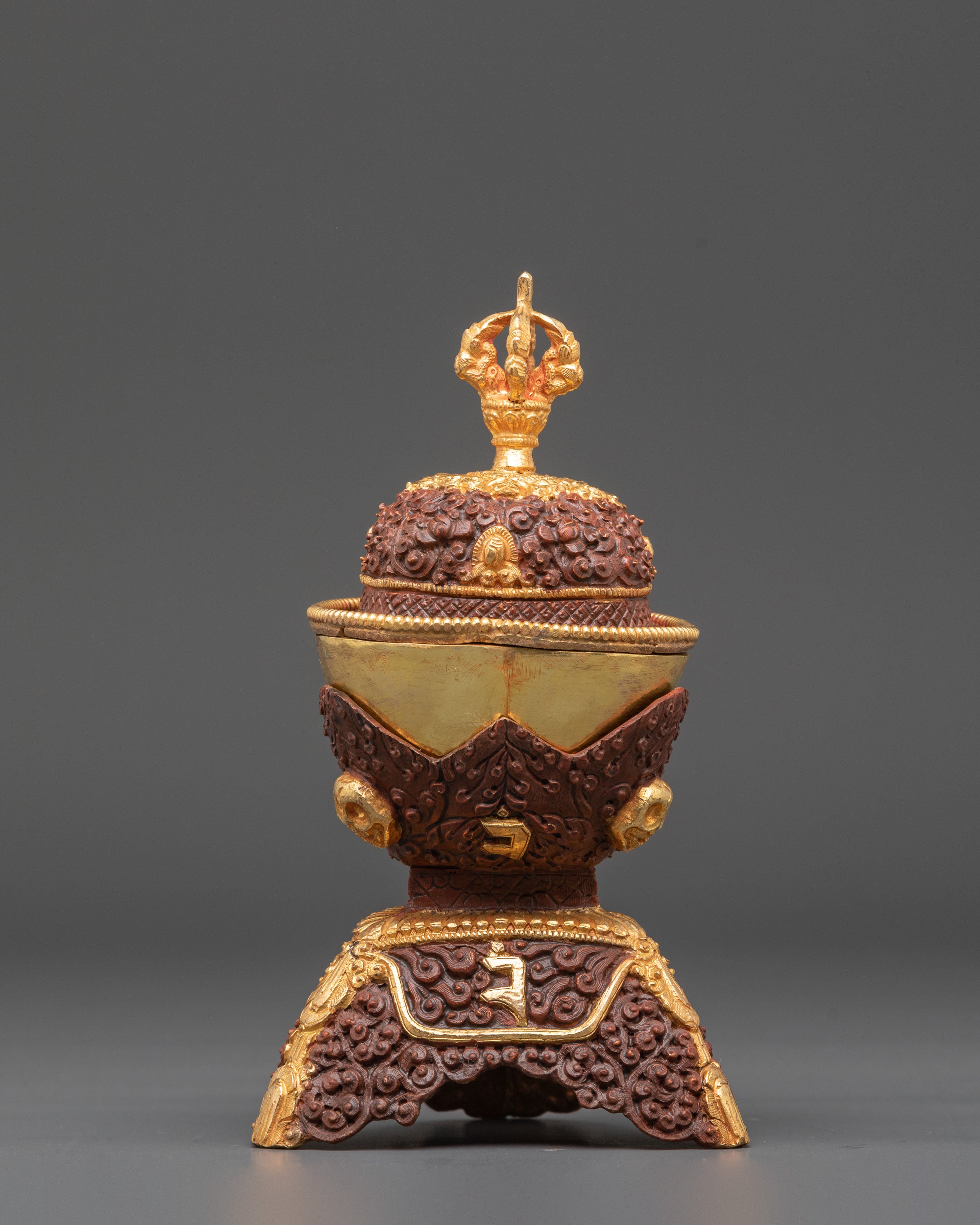 The Kapala set holds the nectar used in higher esoteric rituals. It offers liberation to gods and deities, ensuring their devotion. The offerings are said to be transformed into the Wisdom Nectar, a liquid form of the deity's Enlightened Mind.