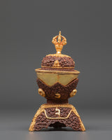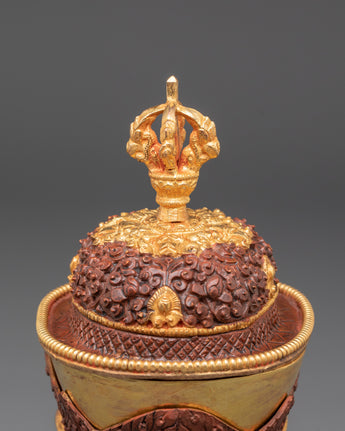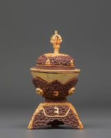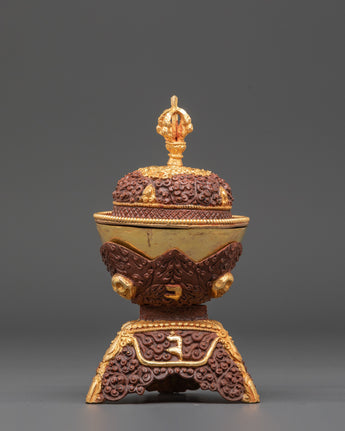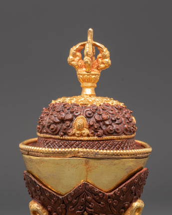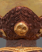 Crafted by skilled Himalayan artisans, this sacred Kapala is made from oxidized copper with delicate gold-plated accents, showcasing a rich contrast that enhances its symbolic power. The dark patina of copper reflects the transience of worldly life, while the radiant gold signifies the enlightened state that transcends it. Every detail—from the smooth bowl to the refined contours—is carefully handmade to preserve traditional artistry and spiritual depth.