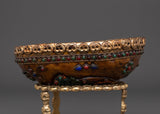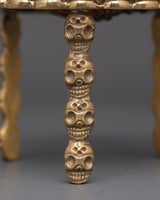 This Resin Kapala Skull Cup is a sacred ritual object from Vajrayana Buddhist traditions, utilized for advanced tantric rites and symbolic sacrifices. This powerful ceremonial bowl is 13cm tall, 12.5cm wide (with a 17cm side width), and weighs 0.53kg. It includes a resin skull cup embellished with silver-plated copper and rests on an intricate brass pedestal. The rim is delicately carved with little skull carvings and gemstone-like ornamentation, symbolizing Buddhism's impermanence, death, and spiritual rebirth cycle.