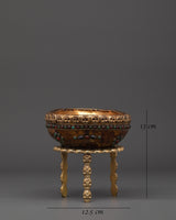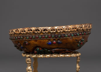 The Kapala set holds the nectar used in higher esoteric rituals. It offers liberation to gods and deities to ensure their devotion. The offerings are said to be transformed into the Wisdom Nectar, a liquid form of the deity's Enlightened Mind.