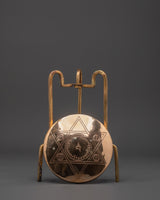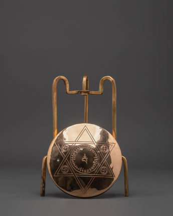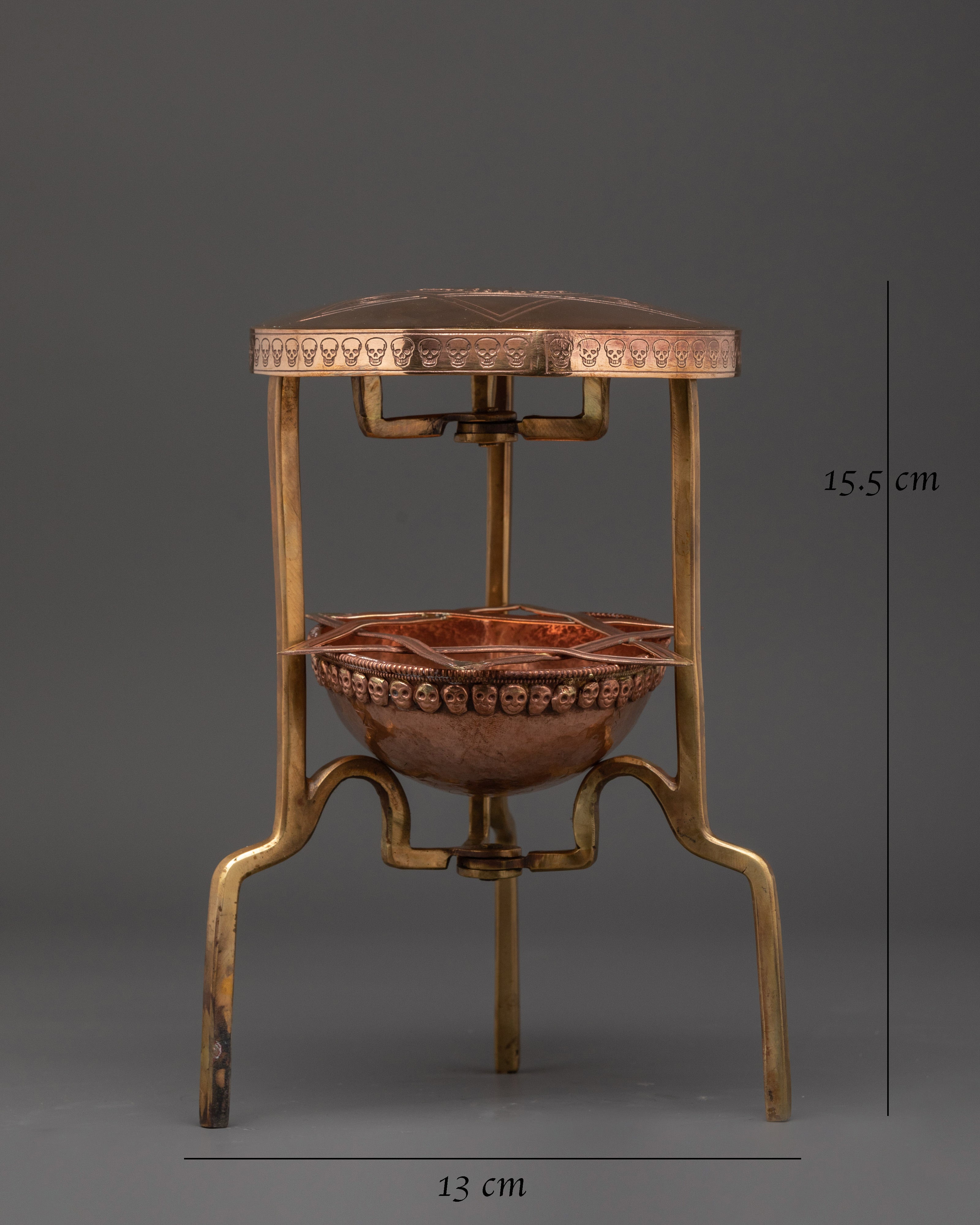 This Ritual Kapala Star, a potent ceremonial item painstakingly created from copper, will elevate your holy ceremonies. The actual kapala star, which is 5 cm tall and 11.5 cm wide with a 13.5 cm side width, is meant to symbolize spiritual metamorphosis and divine geometry. The kapala is a sacred ceremonial instrument used for attracting higher energies, making offerings, and engaging in deep meditation. It is symbolic in both Tibetan and Eastern traditions. This combination gives your altar or meditation area presence and balance with its matching 25.5cm tall stand and 16cm diameter circle base.