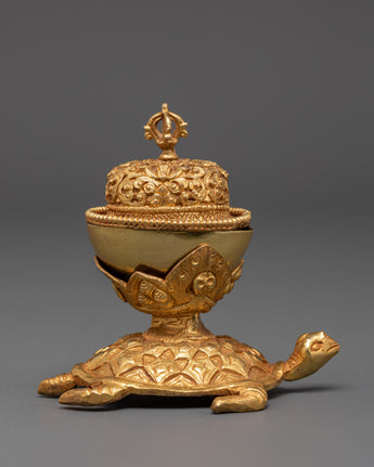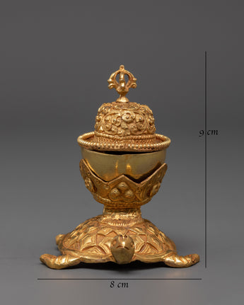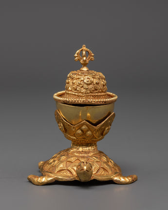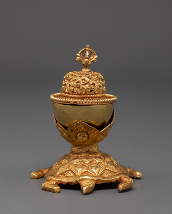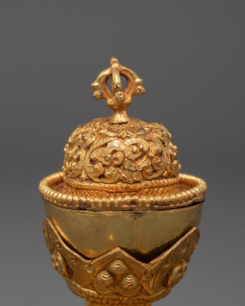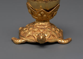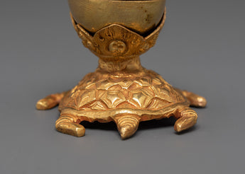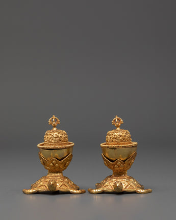 The Sacred Kapala Ritual Set is a deeply revered tool in Tibetan Buddhism, offering a meaningful connection to ancient spiritual practices. Crafted with precision, this set represents a unique piece for rituals and meditation. Its size, with dimensions of 9 cm (height) and 8 cm (width), makes it ideal for intimate rituals and altar placements. The elegant design features intricate copper construction, accentuated by a gold-plated finish, ensuring the set not only serves a spiritual purpose but also holds aesthetic beauty.