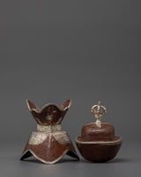 The Sacred Tibetan Kapala Ritual Cup is a meticulously crafted masterpiece, designed for altar offerings and meditation rituals. This Kapala, crafted from oxidized copper with a brass lining and silver plating, radiates spiritual energy and showcases exquisite craftsmanship. It is 19cm in height and 11.5cm in breadth, making it suitable for use in Buddhist rituals, spiritual celebrations, or as a focal point on an altar. The half vajra design at the top of the cup represents indestructibility and the combination of wisdom and compassion, lending spiritual meaning to this potent ritual vessel.