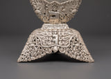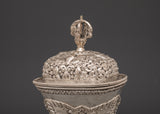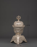 Improve your spiritual practice with this exquisitely handmade Silver Plated Kapala, a traditional Tibetan ceremonial skull cup made of copper and heavily finished with elaborate silver plating. Standing 25cm tall and 15.5cm broad, this ceremonial cup weighs 0.68kg and strikes the ideal mix between durability and beauty. Its complex design features detailed elements that represent significant symbolic value in Tibetan Buddhism and tantric rites, making it a highly sought-after object among practitioners and collectors alike.