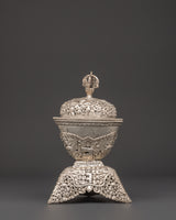 The Kapala has historically been used as a holy vessel in tantric rituals to store offerings such as water, wine, or symbolic items. The silver plating gives a shiny and polished appearance, boosting its spiritual energy and making it ideal for use as a focal point on your altar or meditation room. This kapala is more than just a ceremonial instrument; it represents the transformational power of Buddhist ritual, bringing blessings and spiritual protection. This silver-plated kapala is meticulously created to reflect old Tibetan craftsmanship and spiritual legacy.