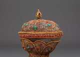 This Spiritual Kapala Offering Cup is 23.5cm tall and 17.5cm wide, with a weight of 2.52kg, making it a stunning centerpiece for any altar. This sacred ritual cup is expertly fashioned from copper with a rich gold plating and antique finish, capturing the symbolic spirit of the kapala, a vessel traditionally employed in Vajrayana Buddhist and Tantric ceremonies. Its skull-inspired design symbolizes the turning of ignorance into wisdom and serves as a reminder of impermanence and spiritual enlightenment.