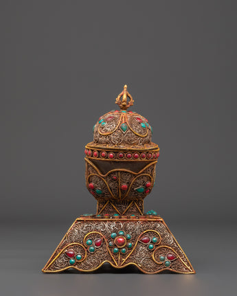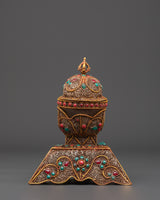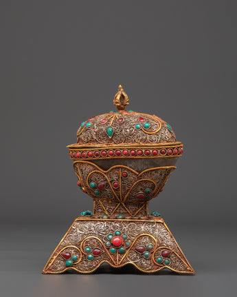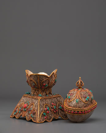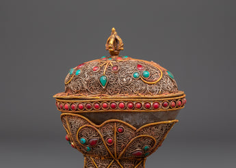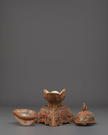 The Kapala set holds the nectar used in higher esoteric rituals. It offers liberation to gods and deities to ensure their devotion. The offerings are said to be transformed into the Wisdom Nectar, a liquid form of the deity's Enlightened Mind.