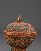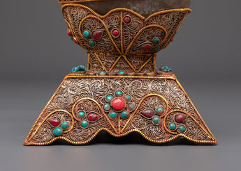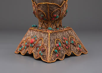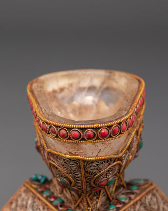 This kapala is handcrafted from copper with rich gold plating and an antique finish, highlighting intricate creativity and spiritual symbolism. The superb craftsmanship emphasizes ritual aspects, making it both a ceremonial tool and a sacred work of Buddhist art. During puja and tantric ceremonies, the kapala giving cup is frequently filled with offerings that represent generosity, devotion, and the path to enlightenment.