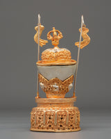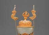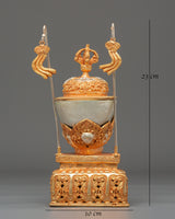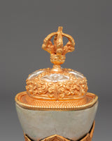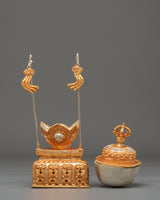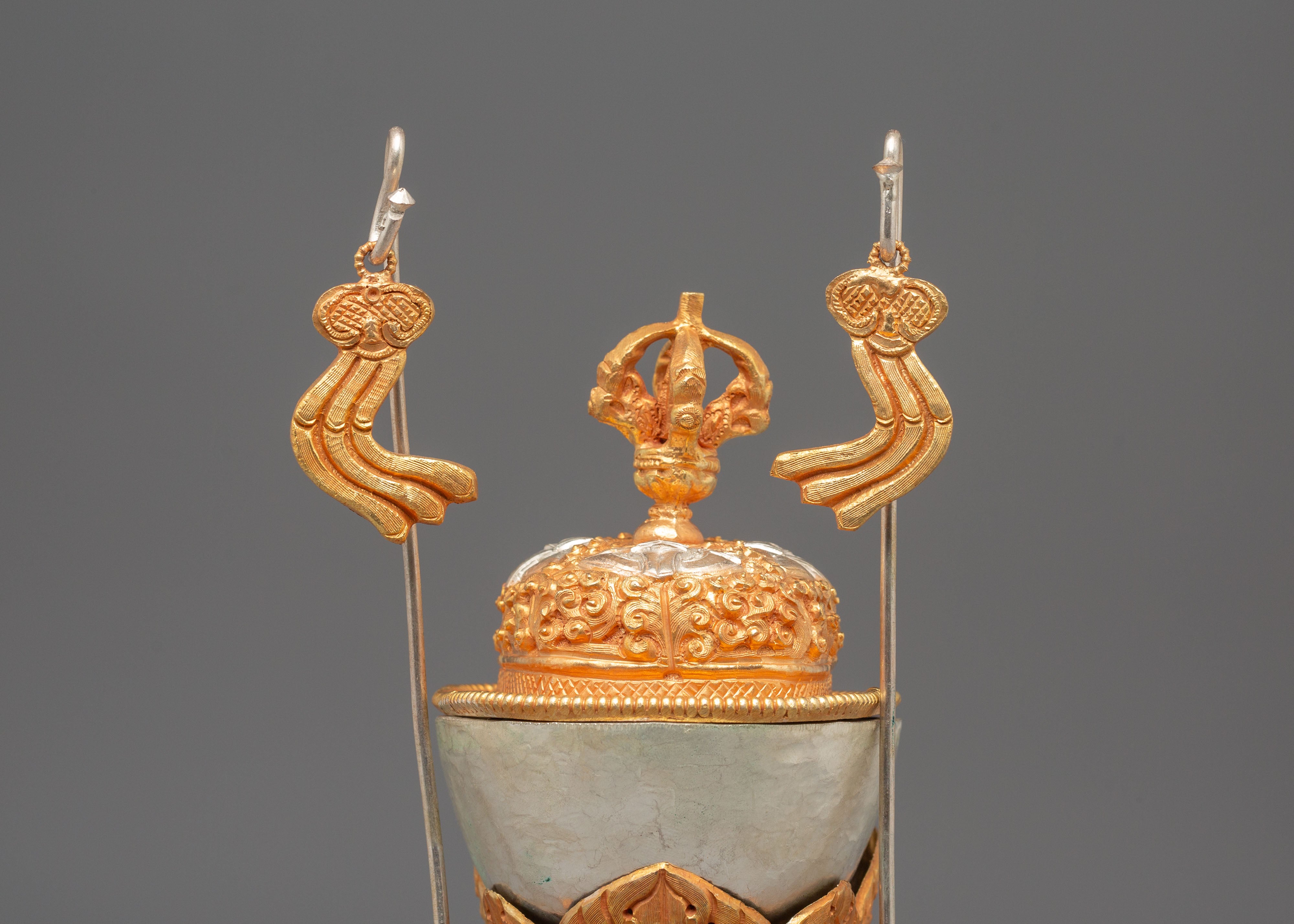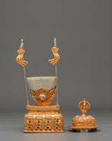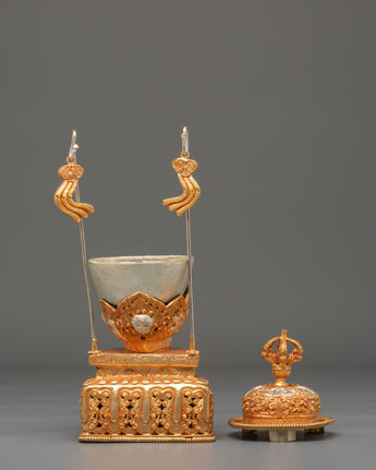 The Kapala set holds the nectar used in higher esoteric rituals. It offers liberation to gods and deities, ensuring their devotion. The offerings are said to be transformed into the Wisdom Nectar, a liquid form of the deity's Enlightened Mind.