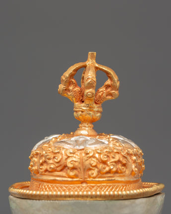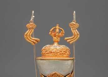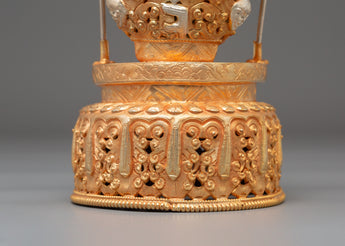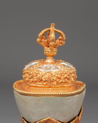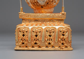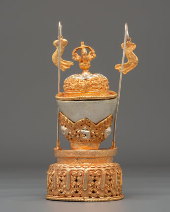 This Kapala ceremonial vessel features detailed metalwork with traditional motifs and symbolic forms that capture the essence of Tibetan spiritual aesthetics. The intricate carvings, floral patterns, and crown-like finial at the top symbolize wisdom, compassion, and the connection between the material and the divine. The combination of silver and gold plating enhances its visual brilliance and spiritual resonance, making it not just a ritual object but a meaningful piece of sacred art. Every curve and embellishment conveys the artisan's devotion and the spiritual power of the tradition it represents.
