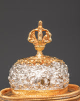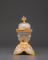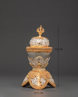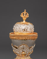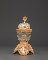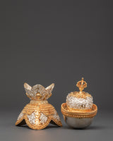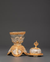 This Tibetan Ritual Kapala Set is a sacred ceremonial object that is often used in advanced Vajrayana and tantric Buddhist practices. It stands 19 centimeters tall and 10.5 centimeters broad, and is expertly constructed with a copper body finished in amazing electro-gold and silver plating. The beautiful Vajra-shaped lid represents spiritual power and unshakeable clarity in Buddhist doctrine. It is sometimes used in rituals to represent the sacrifice of ego, delusion, or nectar to enlightened entities.