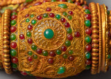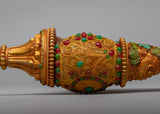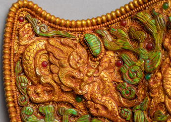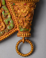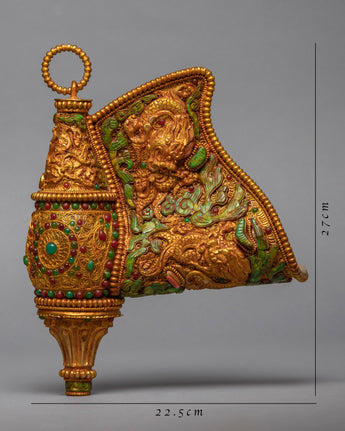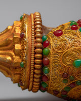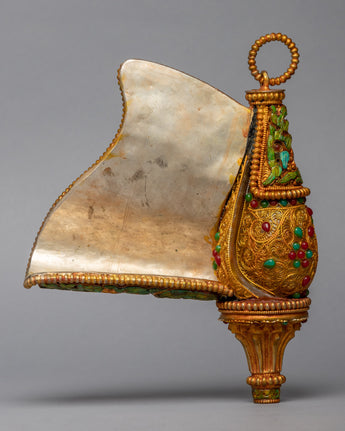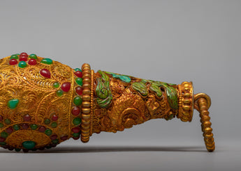 Sankha is a beautiful and intricate ritual item handcrafted from copper and plated in 24k gold. Its beautiful design is enhanced by the presence of embedded gemstones, which add to its aesthetic appeal. The sankha has a luxurious and ornate appearance due to the combination of copper and gold plating, making it a popular decorative item as well. The gemstones embedded in the sankha add beauty and symbolism, with each gemstone having its own special meaning.