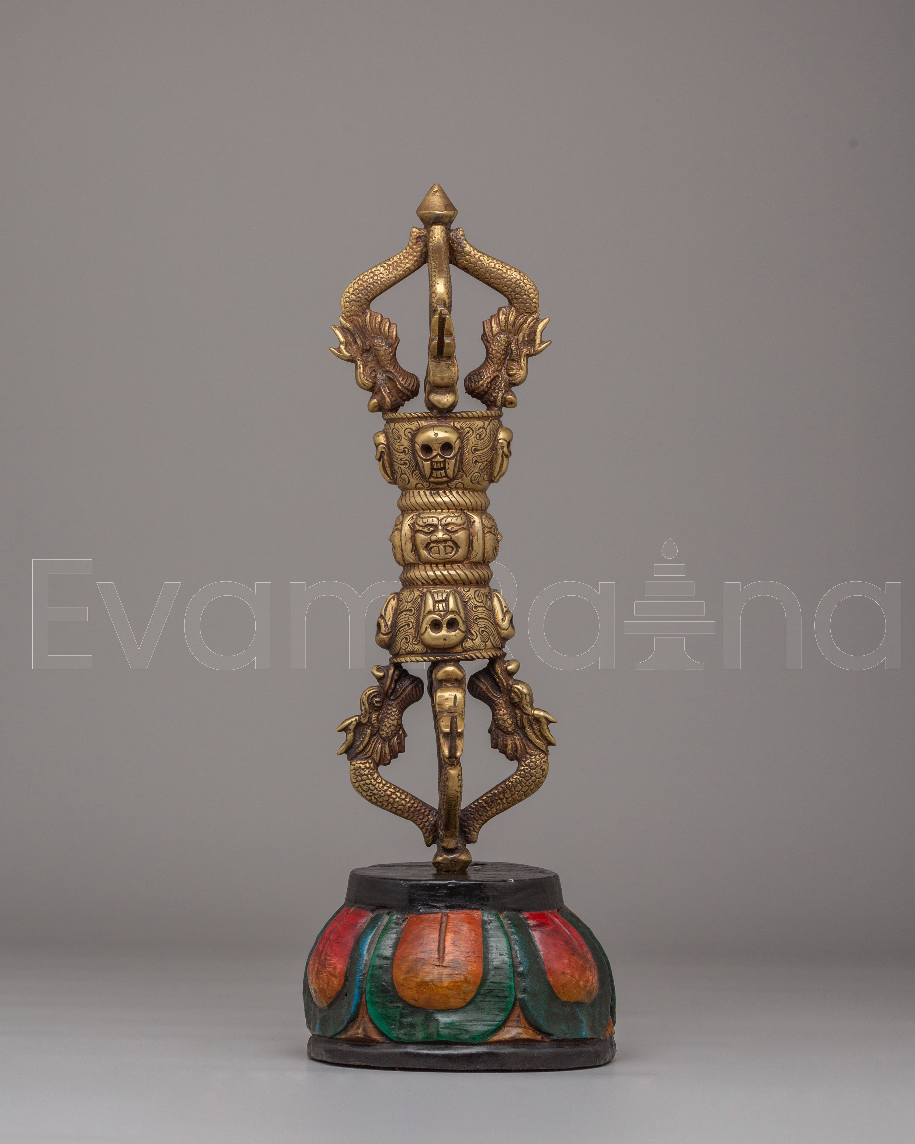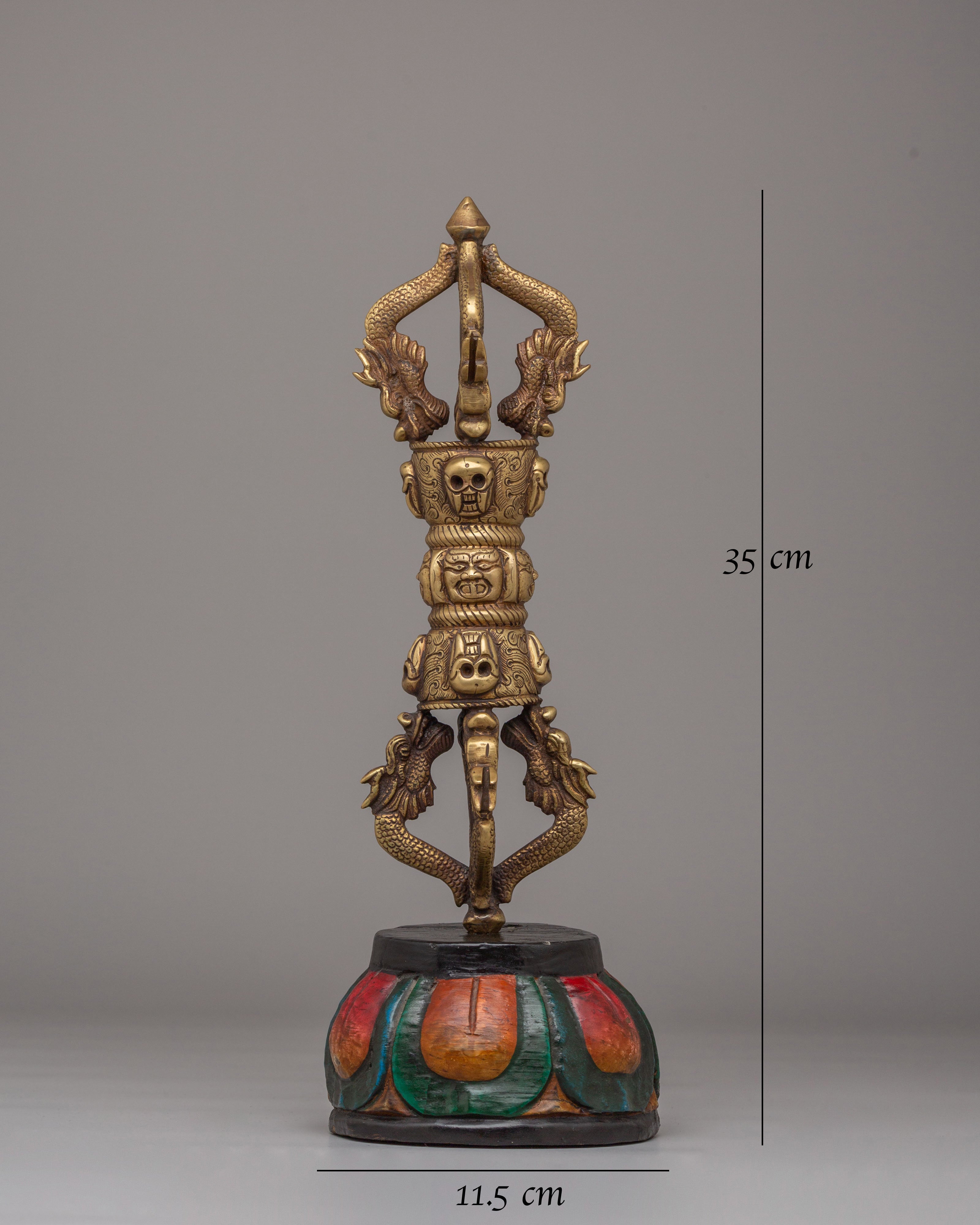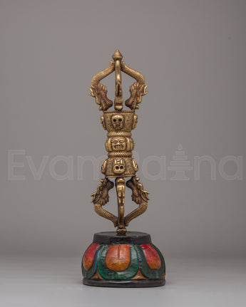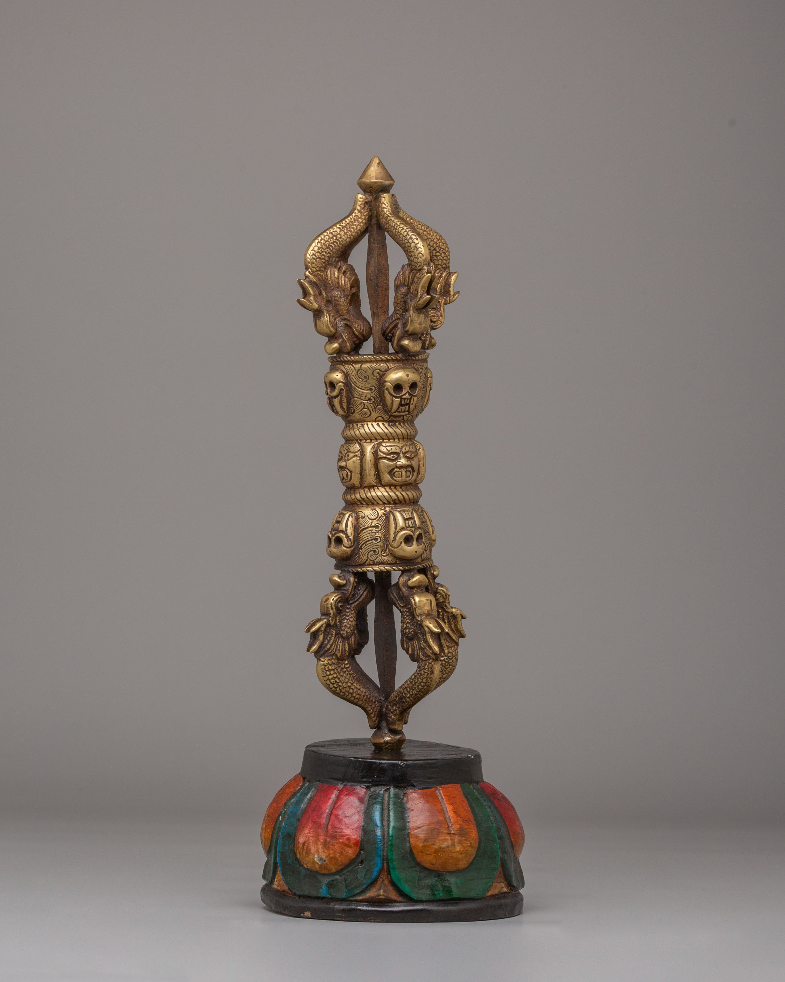 This Vajra Ritual Tool is adorned with skull motifs, a symbol often associated with the destruction of ignorance and the overcoming of obstacles in Buddhist teachings. The serpent-like designs on either side represent wisdom and transformation. The brass construction ensures that this tool is both durable and spiritually significant, making it ideal for use in meditation, rituals, or as a symbolic decorative piece. The wooden base features bright, traditional colors, adding an element of sacred artistry to the piece.