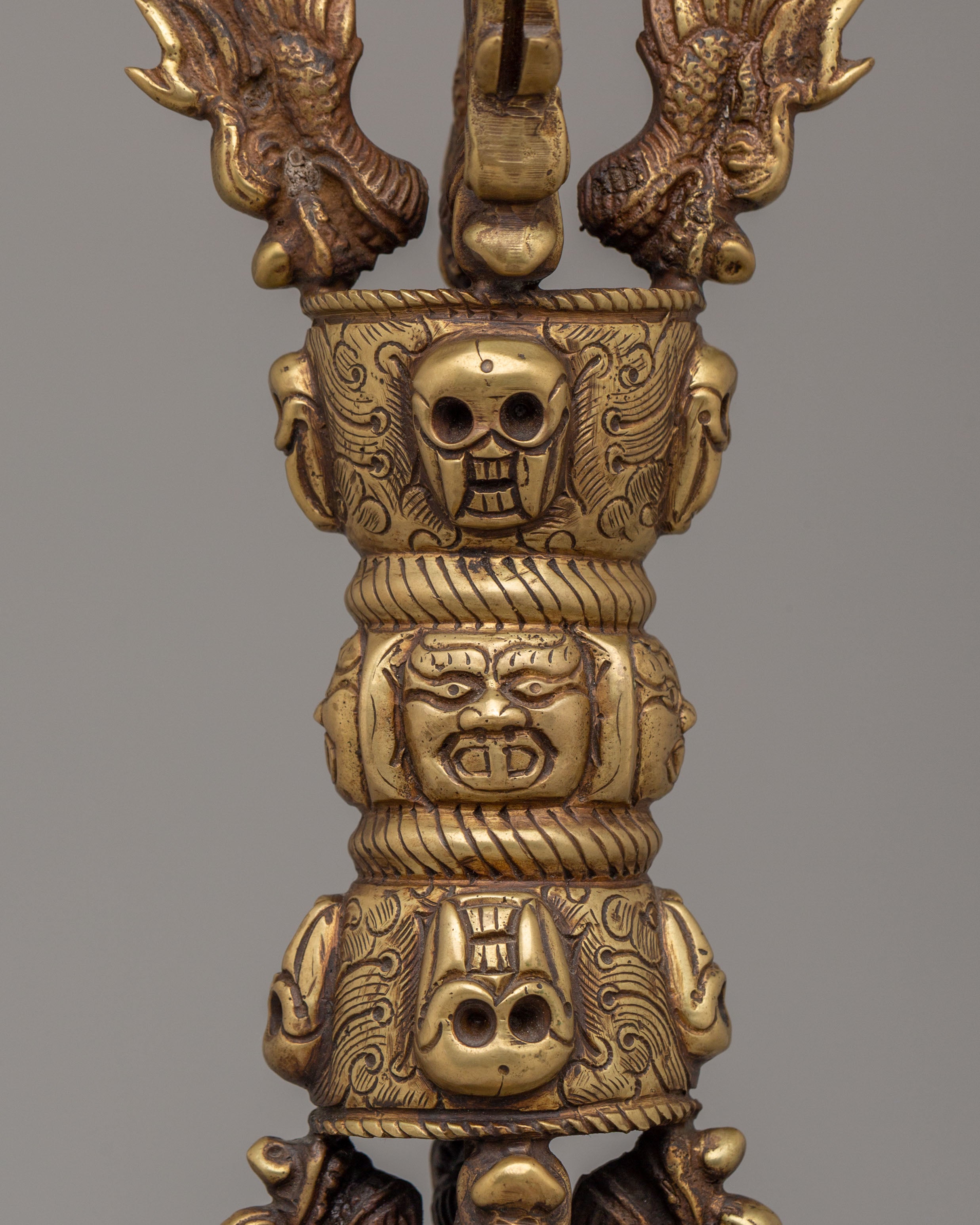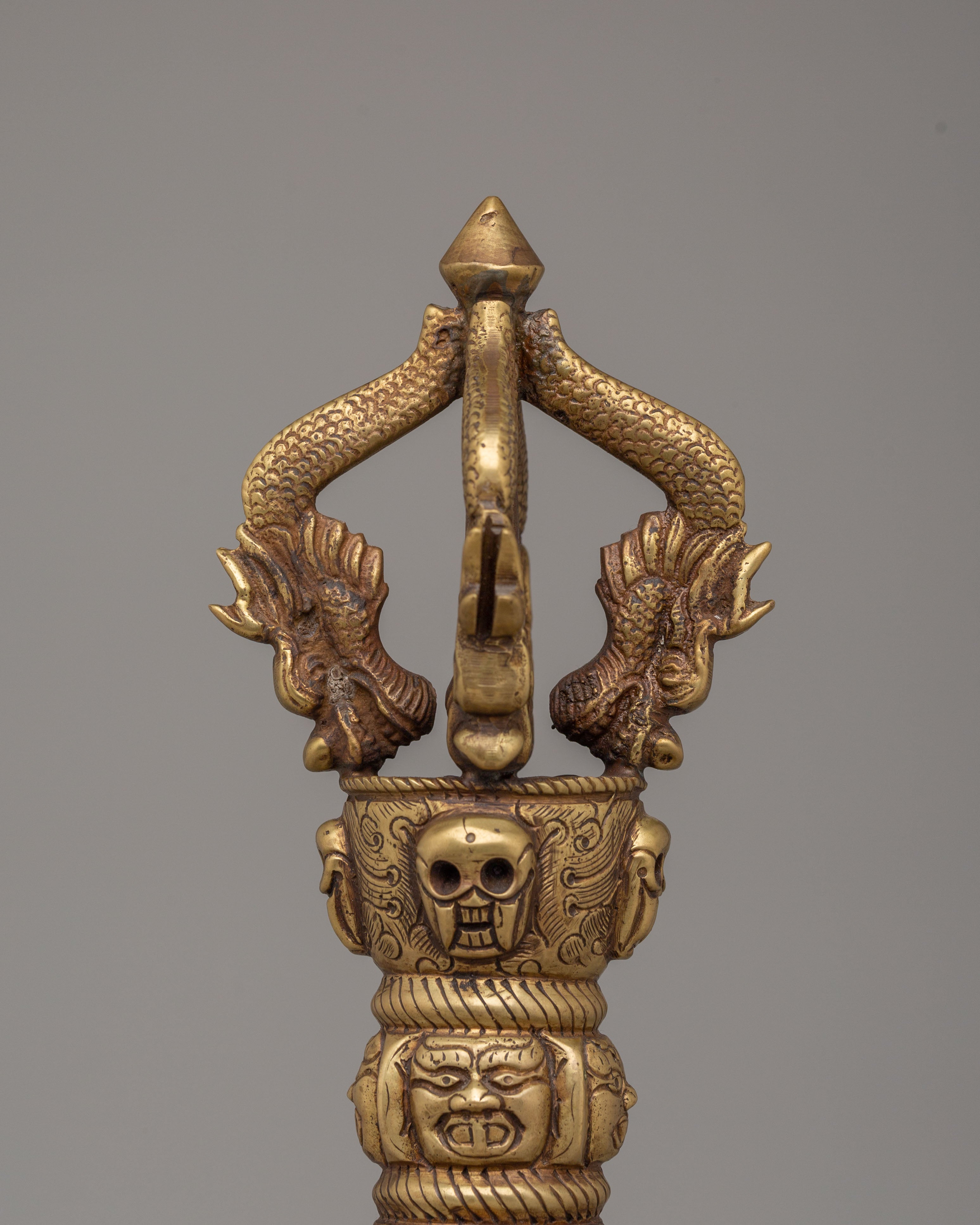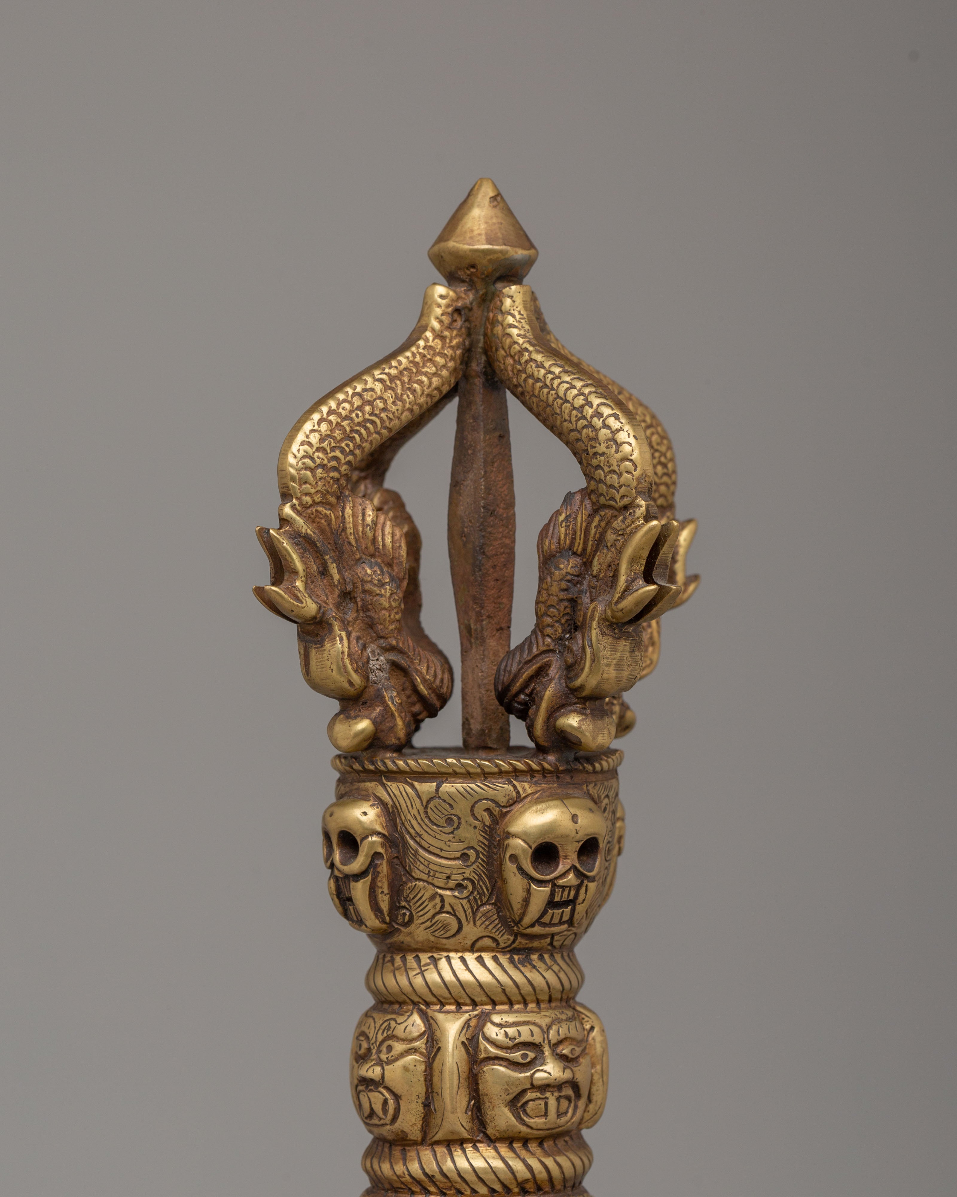 This Vajra Ritual Tool is adorned with skull motifs, a symbol often associated with the destruction of ignorance and the overcoming of obstacles in Buddhist teachings. The serpent-like designs on either side represent wisdom and transformation. The brass construction ensures that this tool is both durable and spiritually significant, making it ideal for use in meditation, rituals, or as a symbolic decorative piece. The wooden base features bright, traditional colors, adding an element of sacred artistry to the piece.