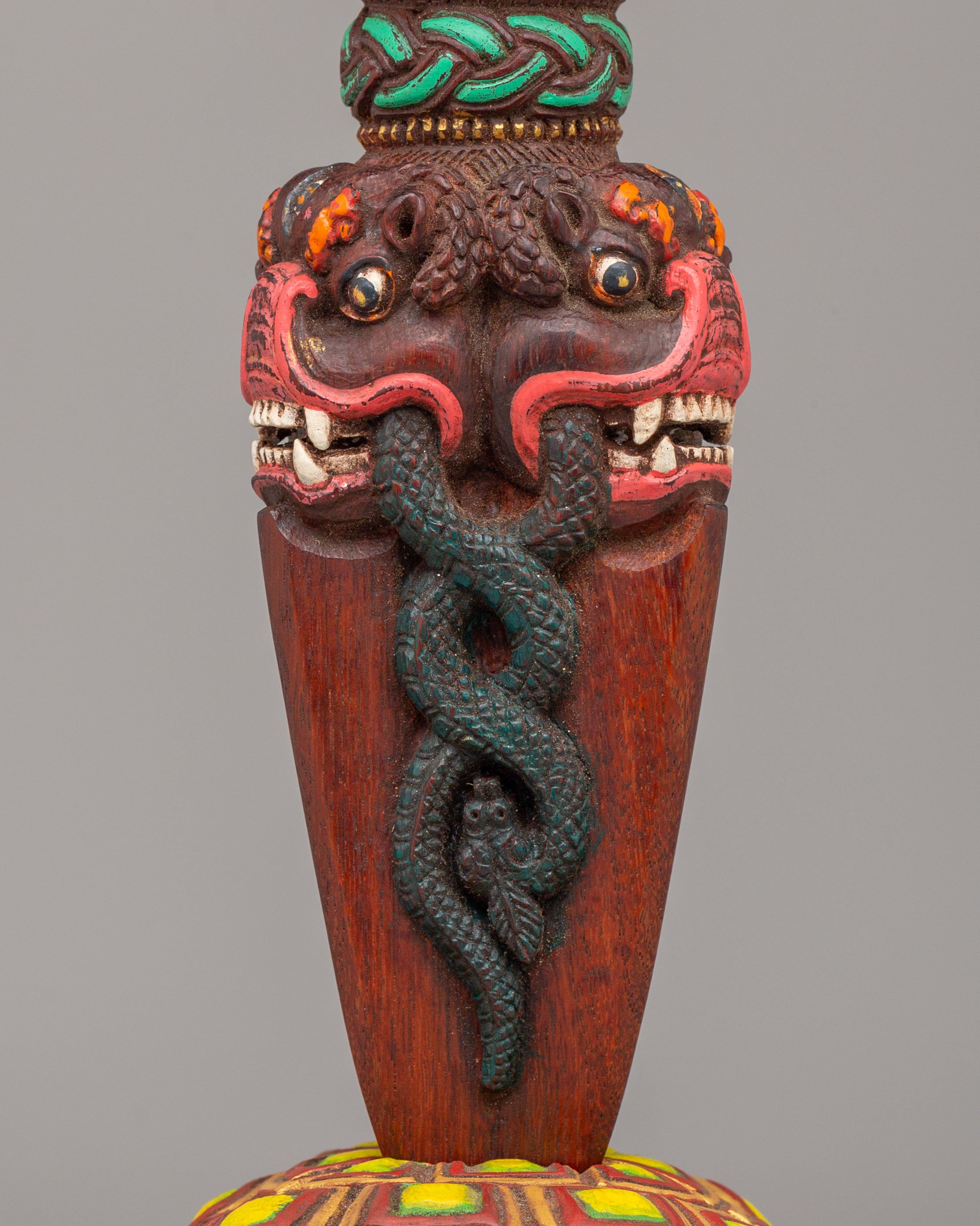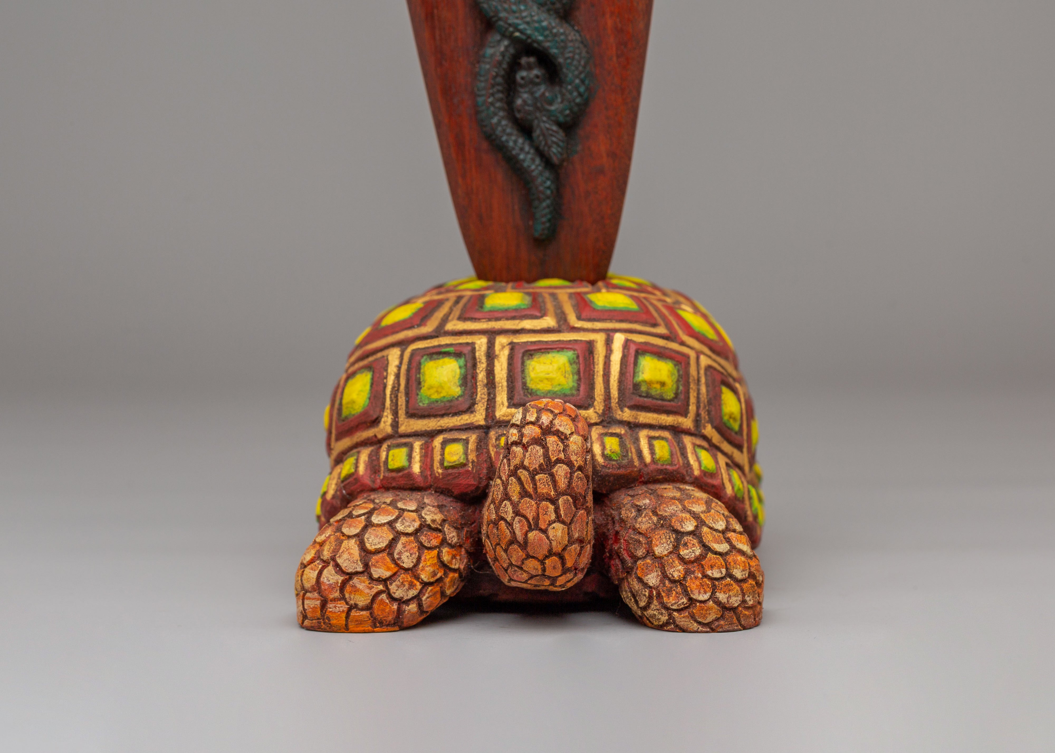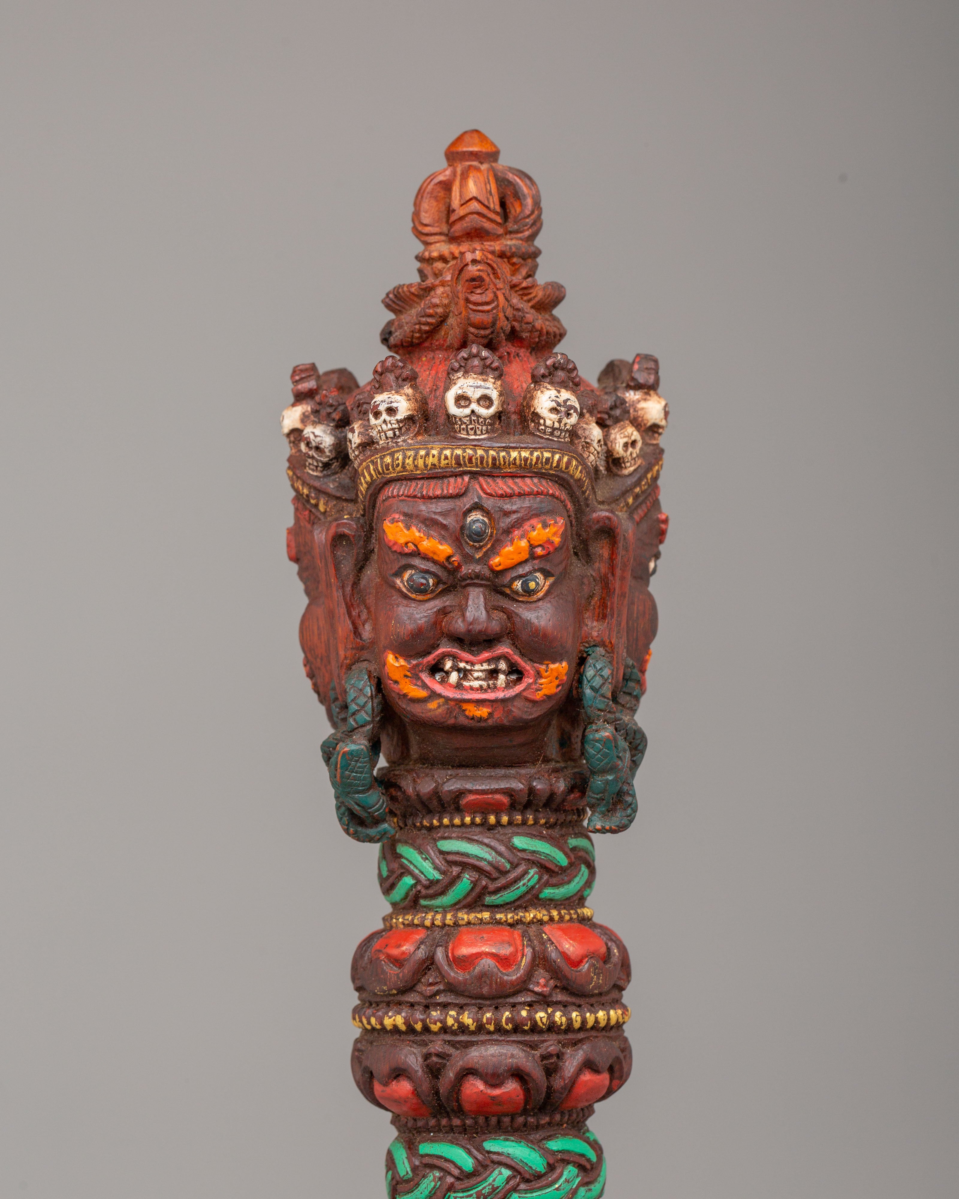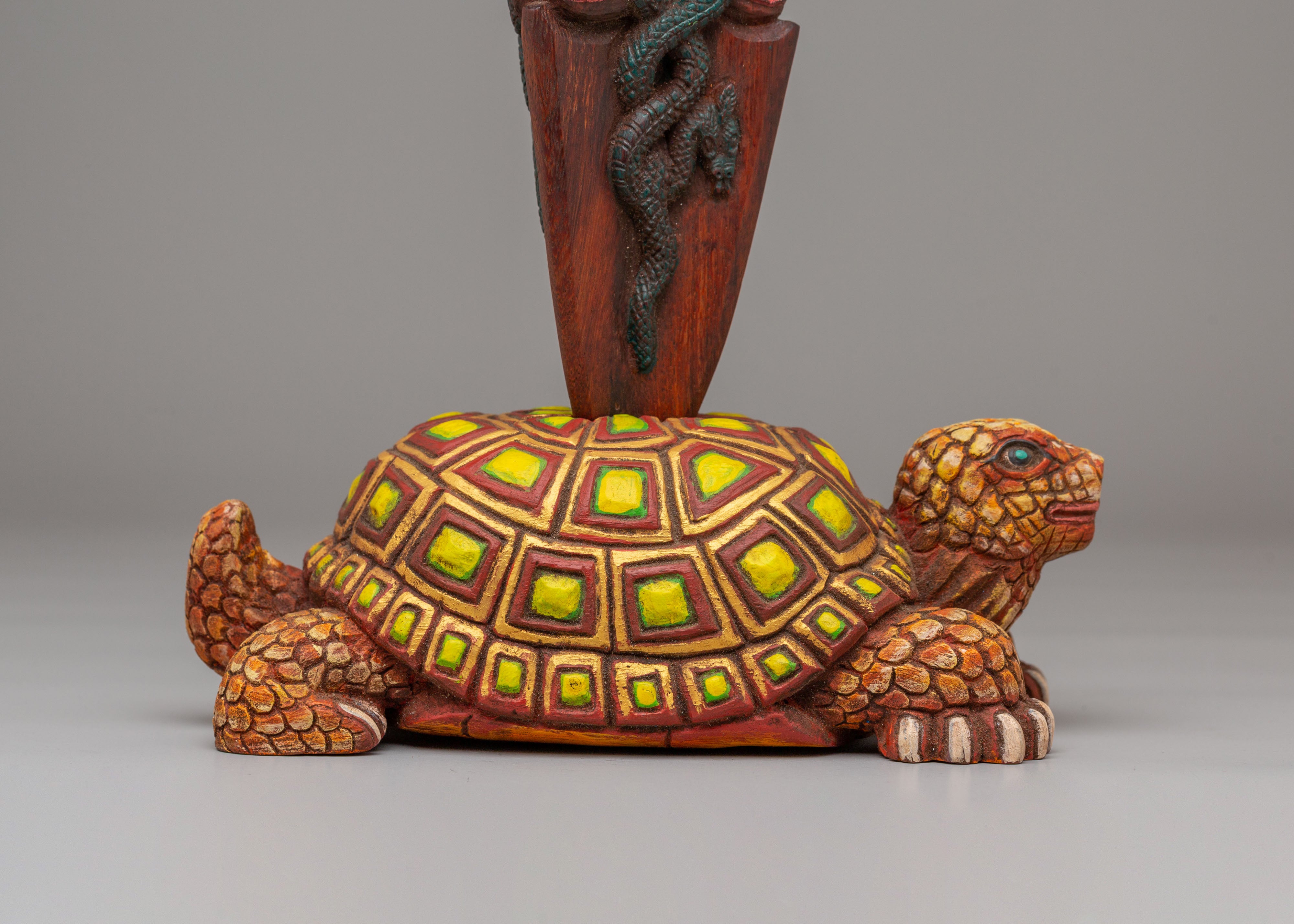 The tortoise base represents the earth element and is a traditional symbol of support and protection in Tibetan culture. It is believed that the tortoise is a guardian of the Earth, which adds a layer of strength to the phurba’s power. The detailed faces and serpentine motifs surrounding the phurba signify the cutting of negative energies and the destruction of obstacles, while the striking acrylic color accents bring visual energy to the piece. The craftsmanship of the phurba combined with the symbolic elements of the tortoise base makes this an exceptional work of art that carries deep spiritual meaning.