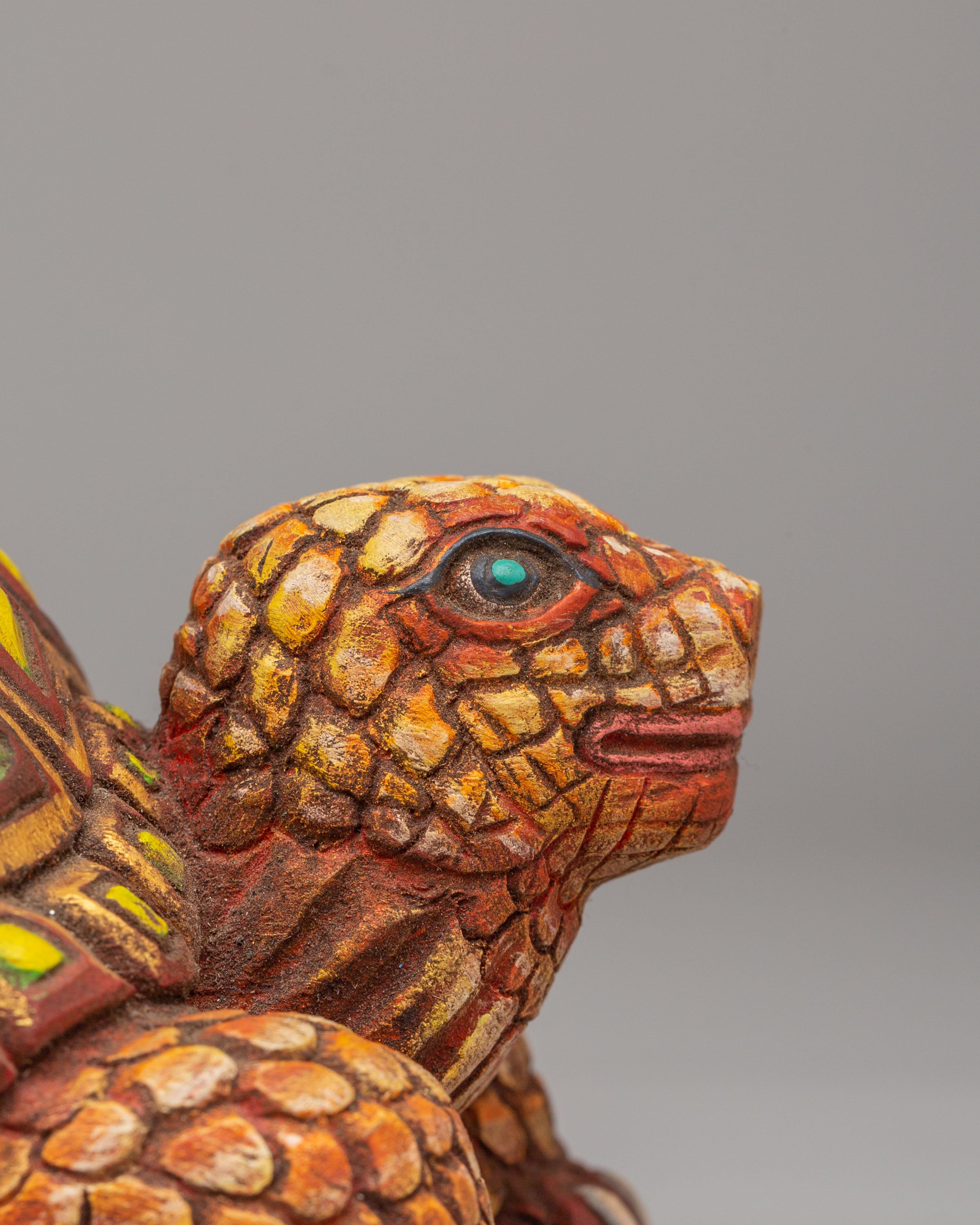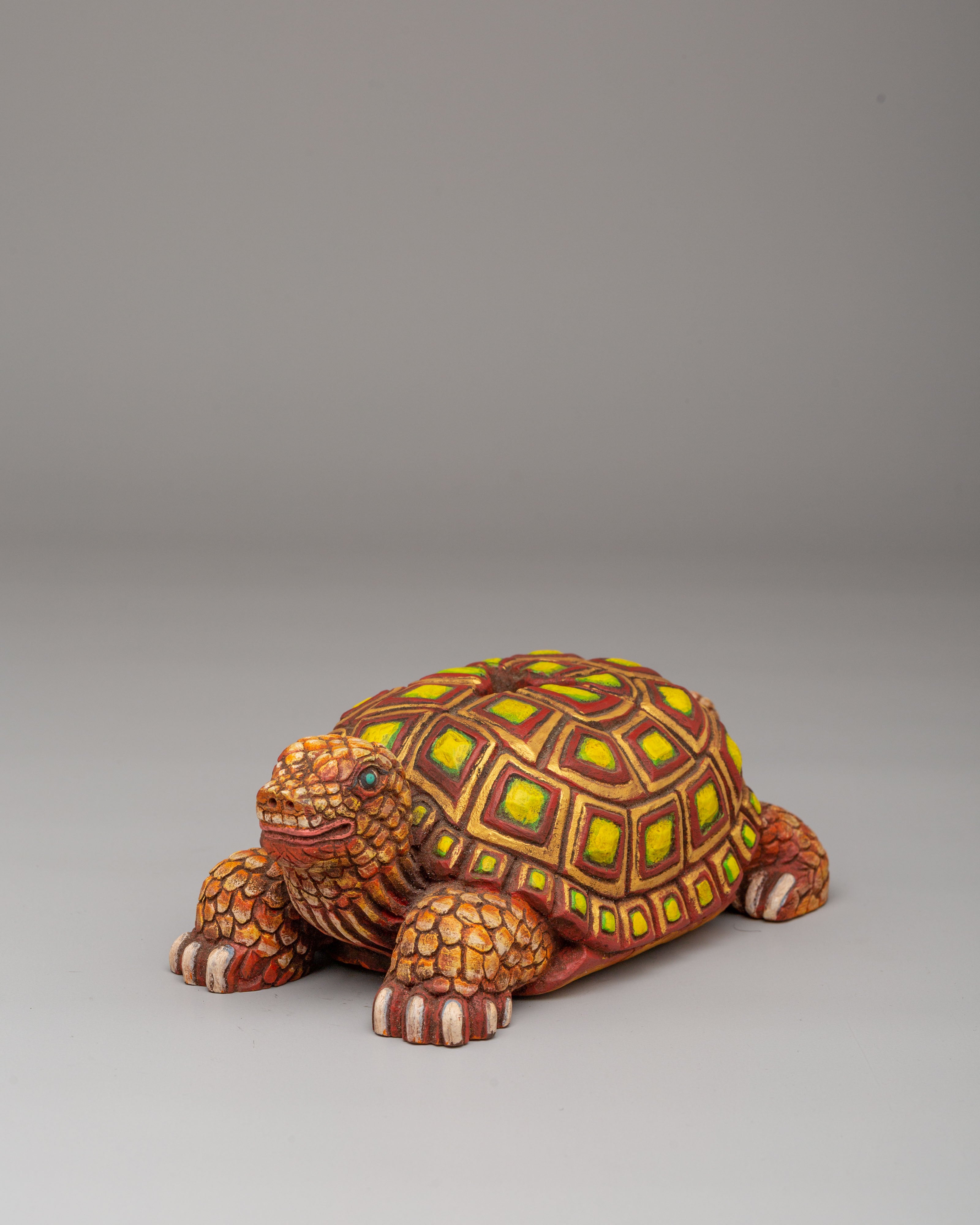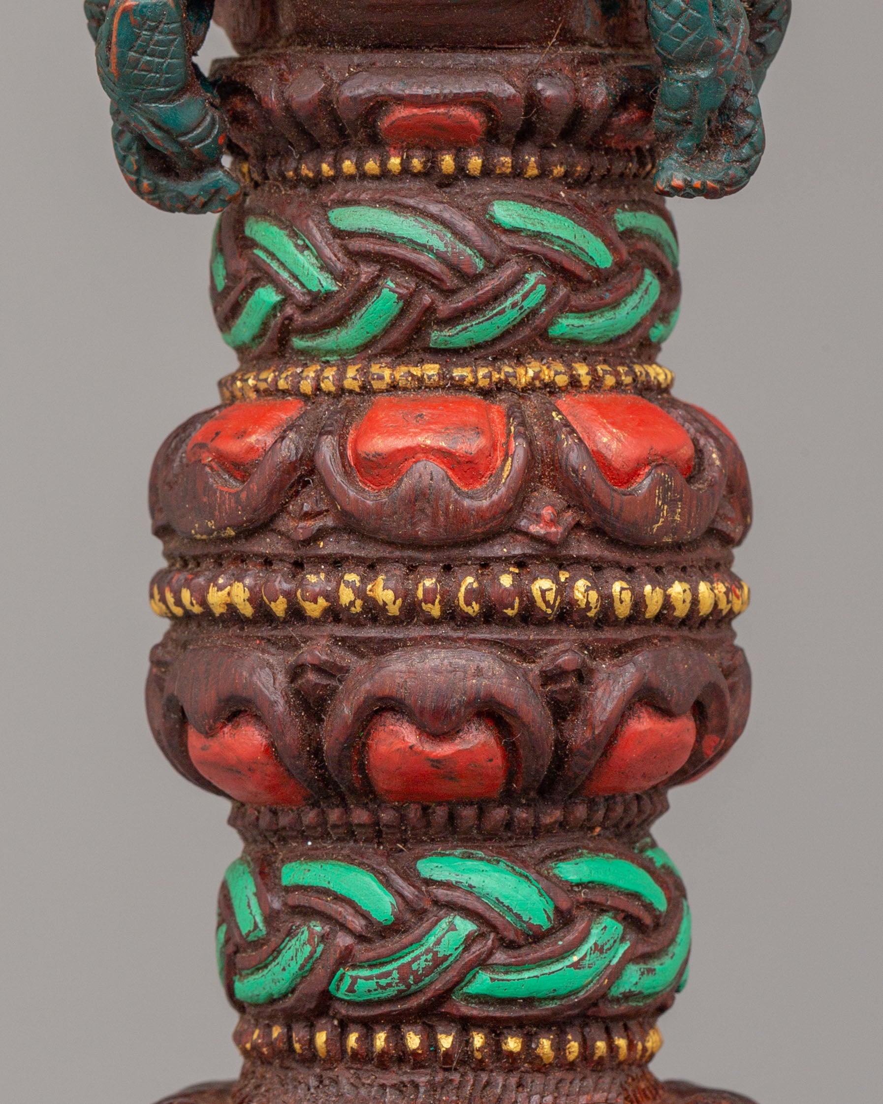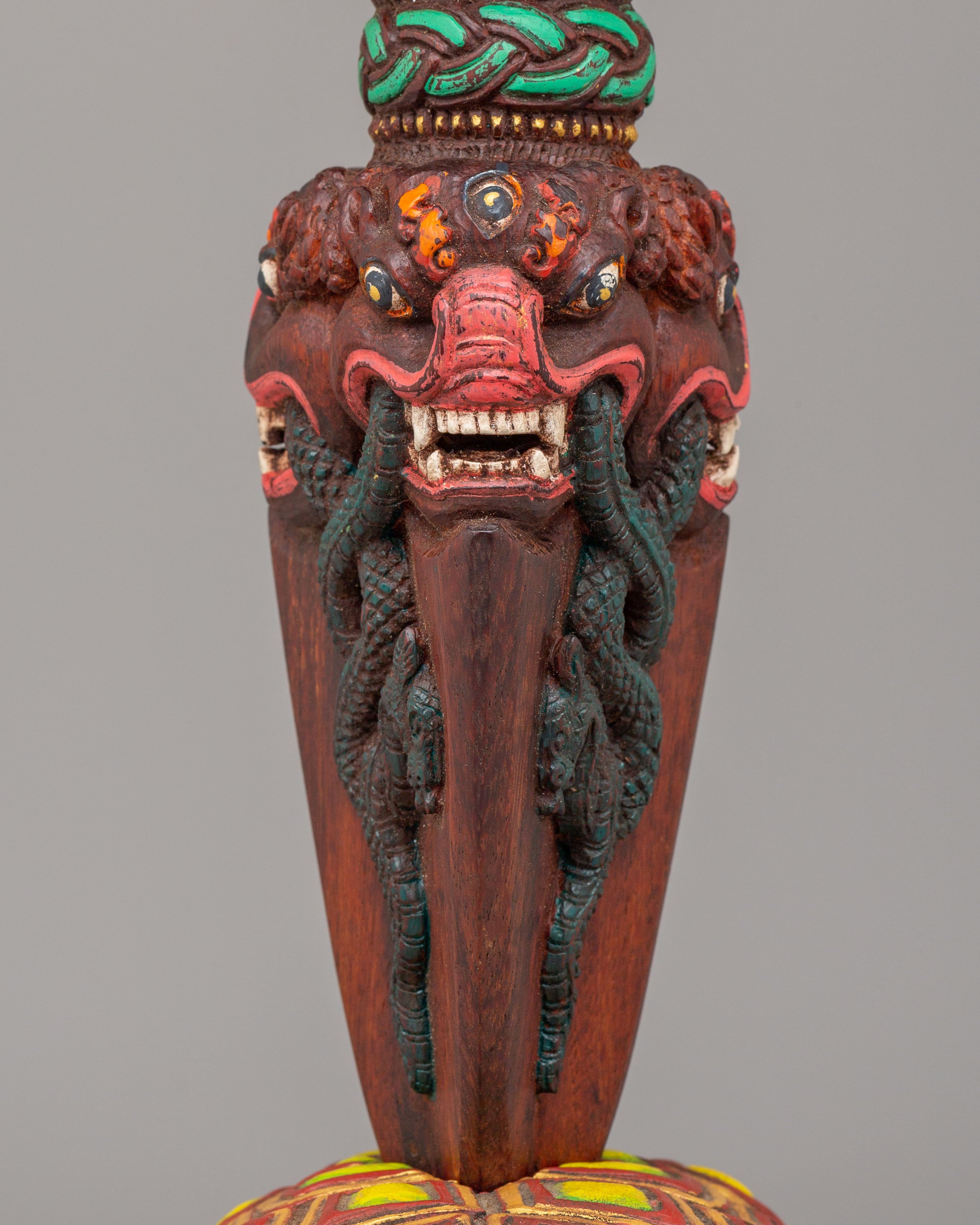 The tortoise base represents the earth element and is a traditional symbol of support and protection in Tibetan culture. It is believed that the tortoise is a guardian of the Earth, which adds a layer of strength to the phurba’s power. The detailed faces and serpentine motifs surrounding the phurba signify the cutting of negative energies and the destruction of obstacles, while the striking acrylic color accents bring visual energy to the piece. The craftsmanship of the phurba combined with the symbolic elements of the tortoise base makes this an exceptional work of art that carries deep spiritual meaning.