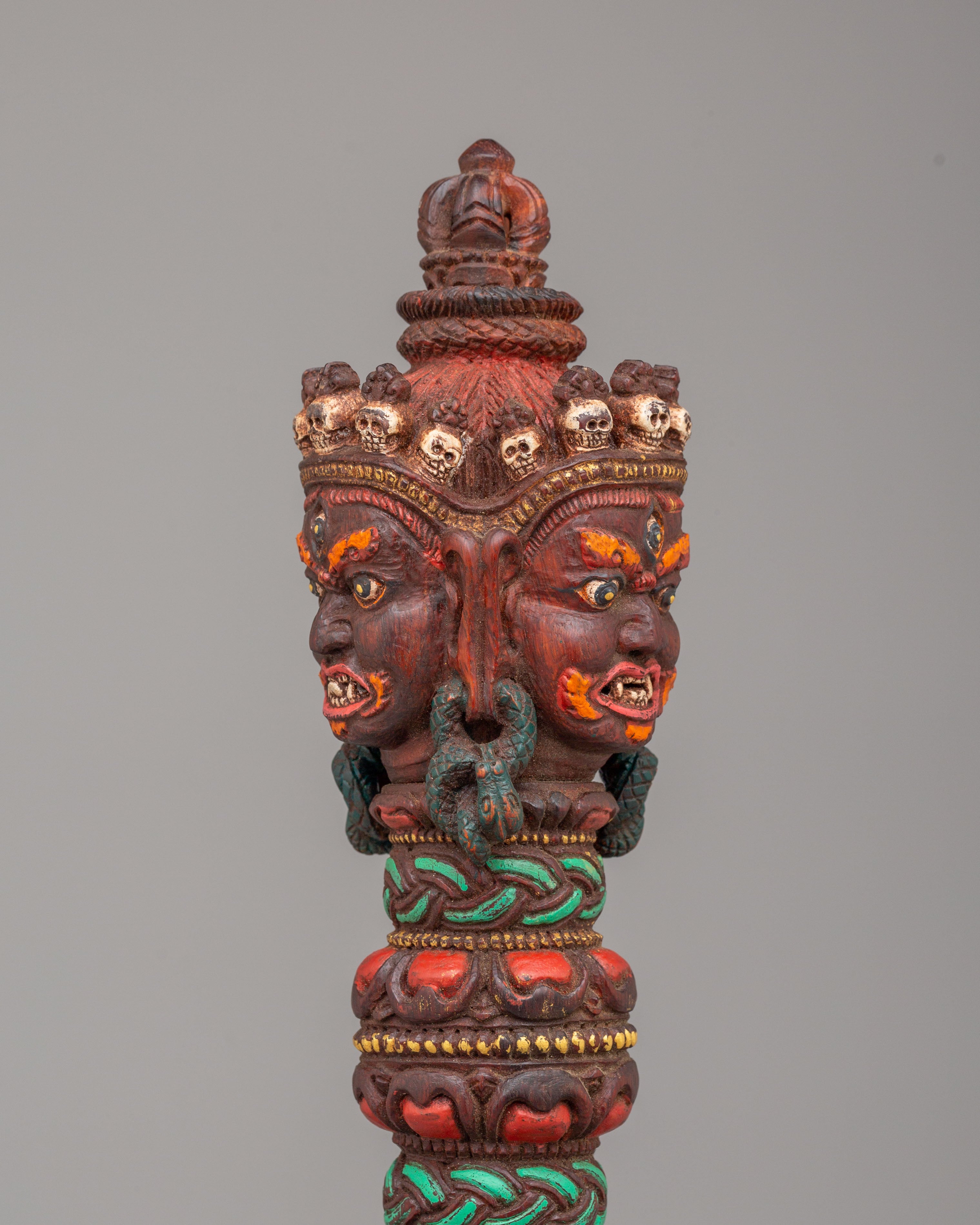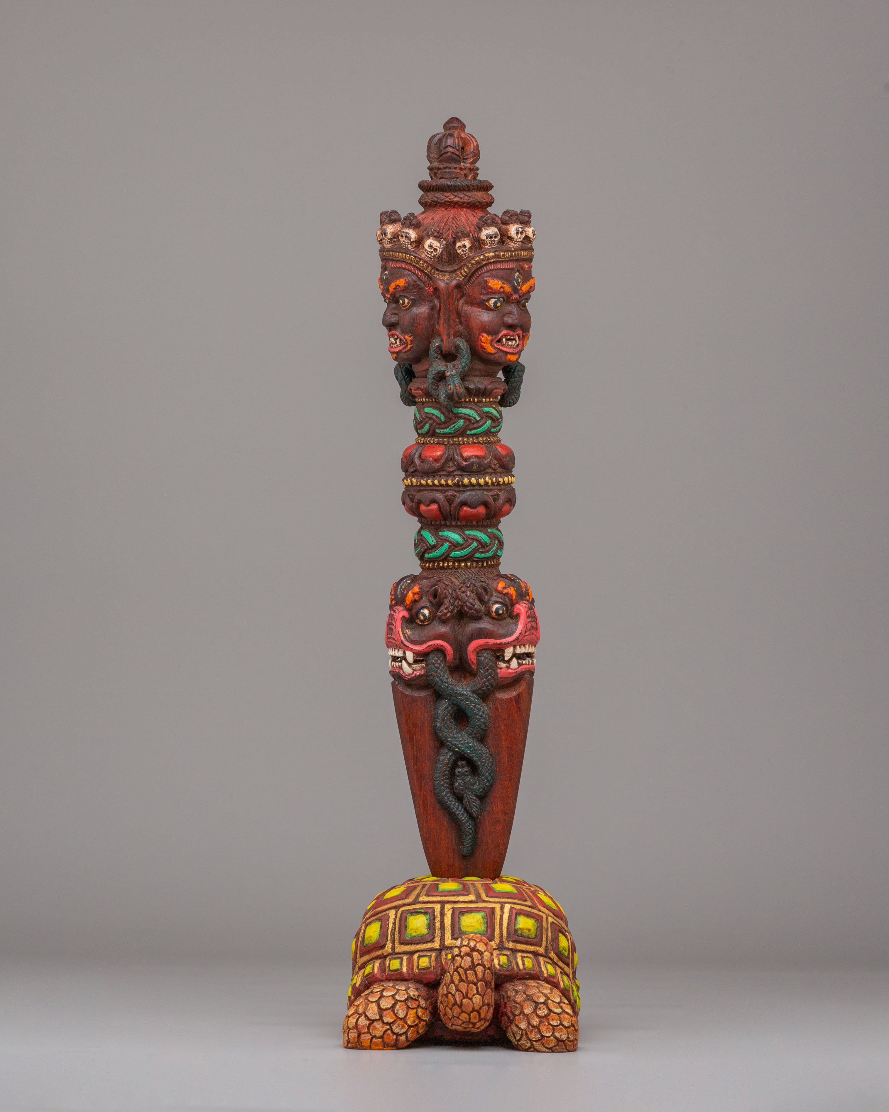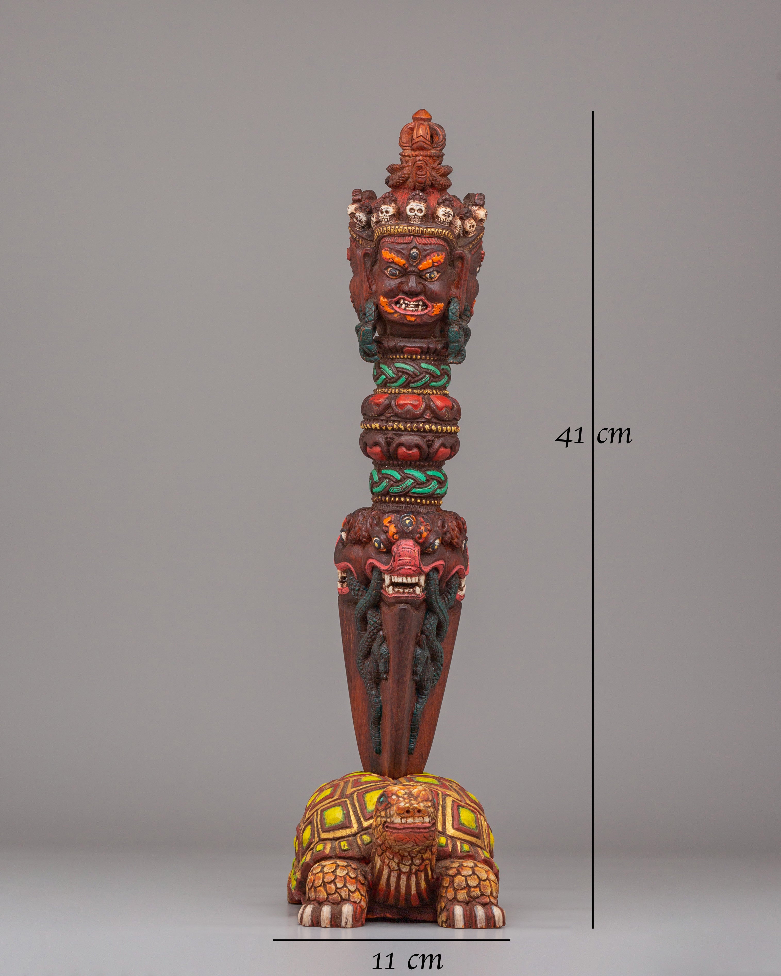 The Hand-Carved Phurba with Tortoise Base is a beautifully crafted and symbolic Tibetan ritual object, meticulously hand-carved from rosewood and painted with vibrant acrylic colors. Standing at 41 cm in height, this phurba features a powerful and detailed tortoise base, symbolizing stability, longevity, and grounding energy. The phurba itself is a three-sided ritual dagger often used in Tibetan Buddhist ceremonies to banish negative energies and protect sacred spaces. The design features intricate motifs, including fierce faces and dynamic forms, which represent the spiritual power of transformation.