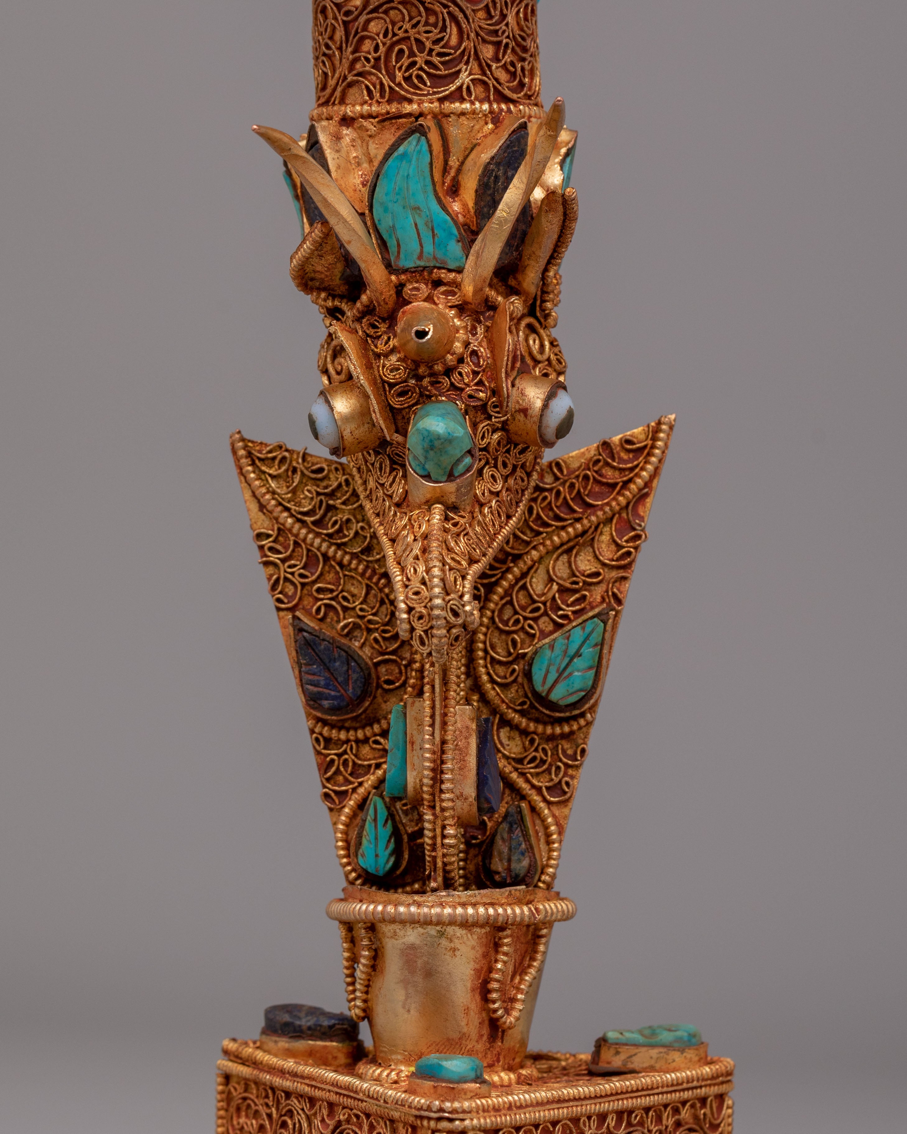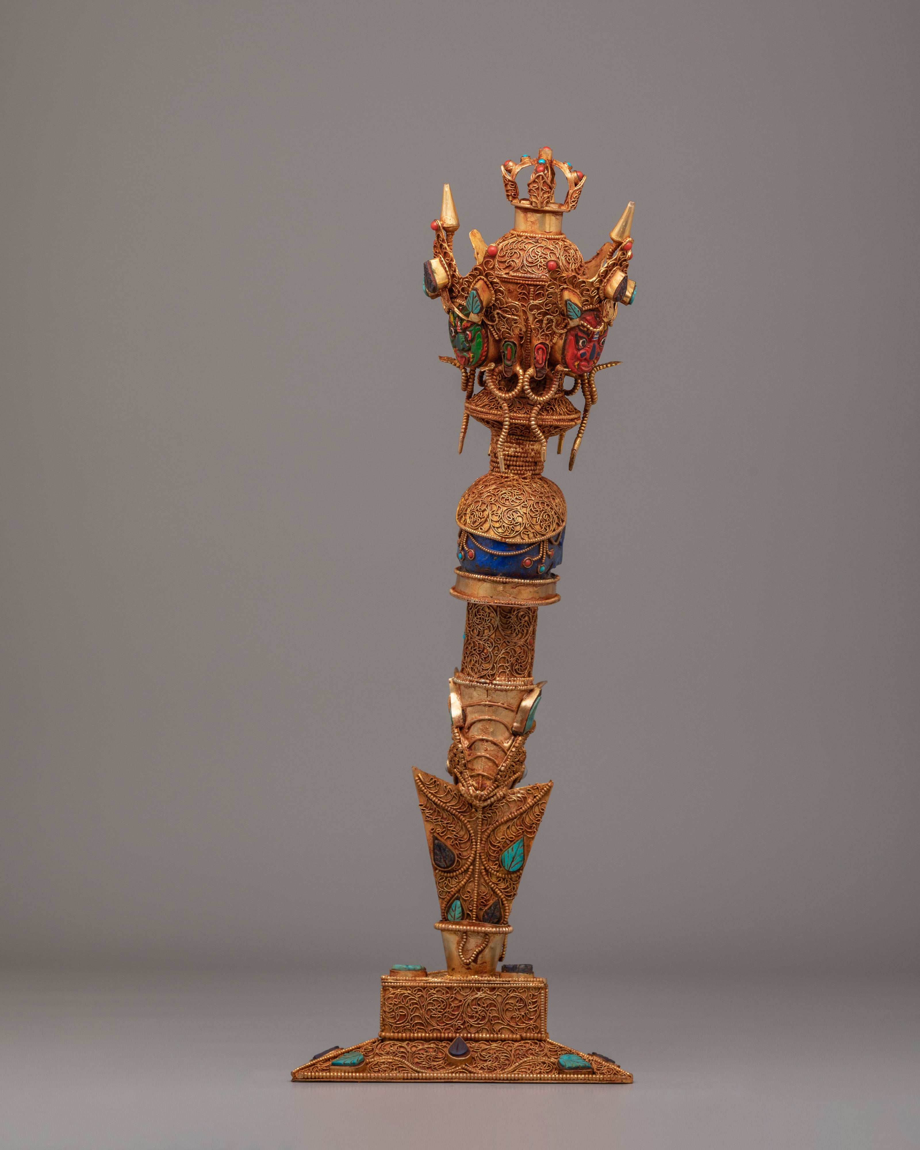 Ideal for collectors, practitioners, and lovers of Tibetan ritual art, this Phurba dagger serves as both a ceremonial object and a statement piece for altar or home decor. It represents protection, grounding, and spiritual power, making it a meaningful addition to meditation spaces or sacred collections. Whether displayed or used in ritual context, this handcrafted piece carries deep cultural significance and a commanding presence.