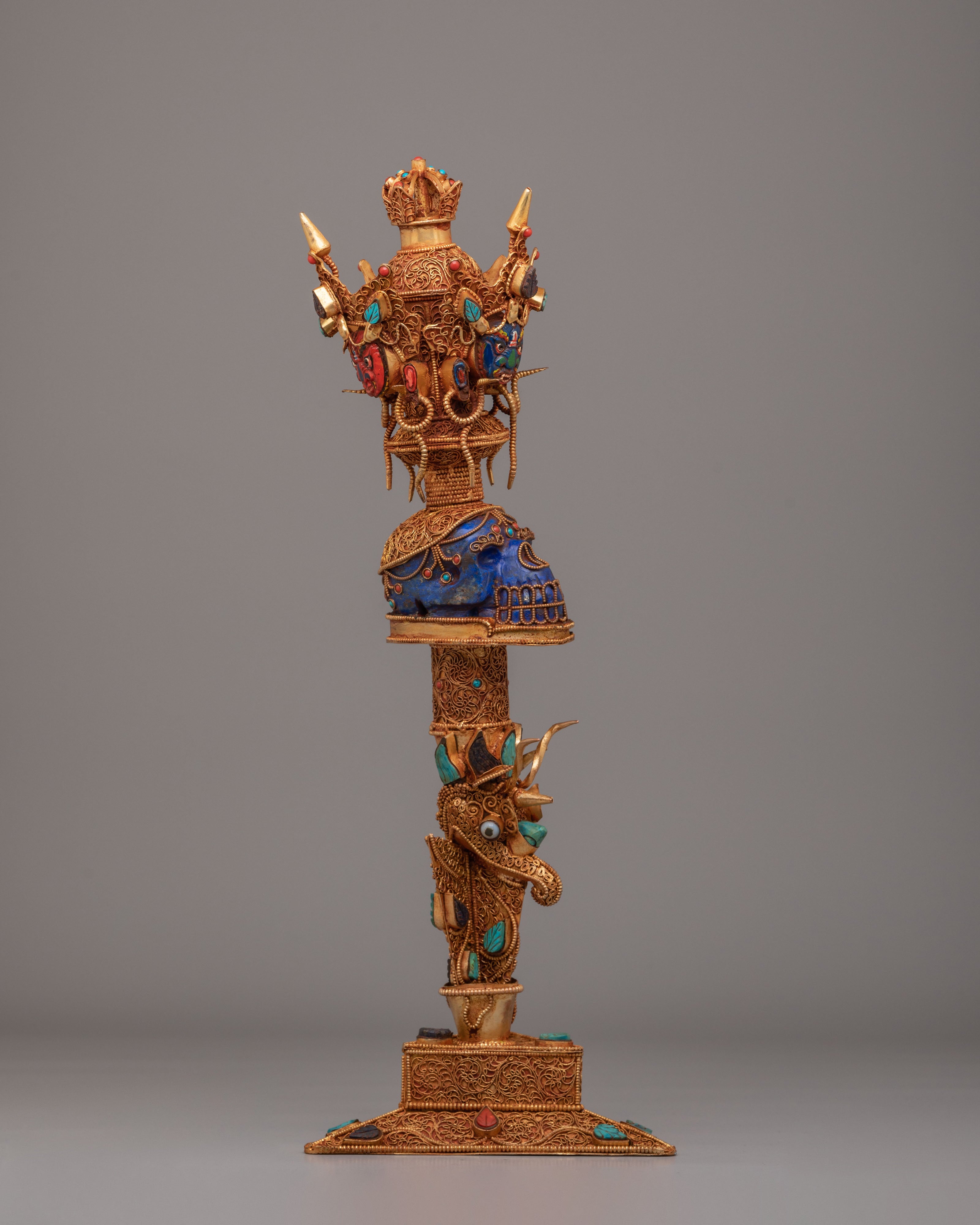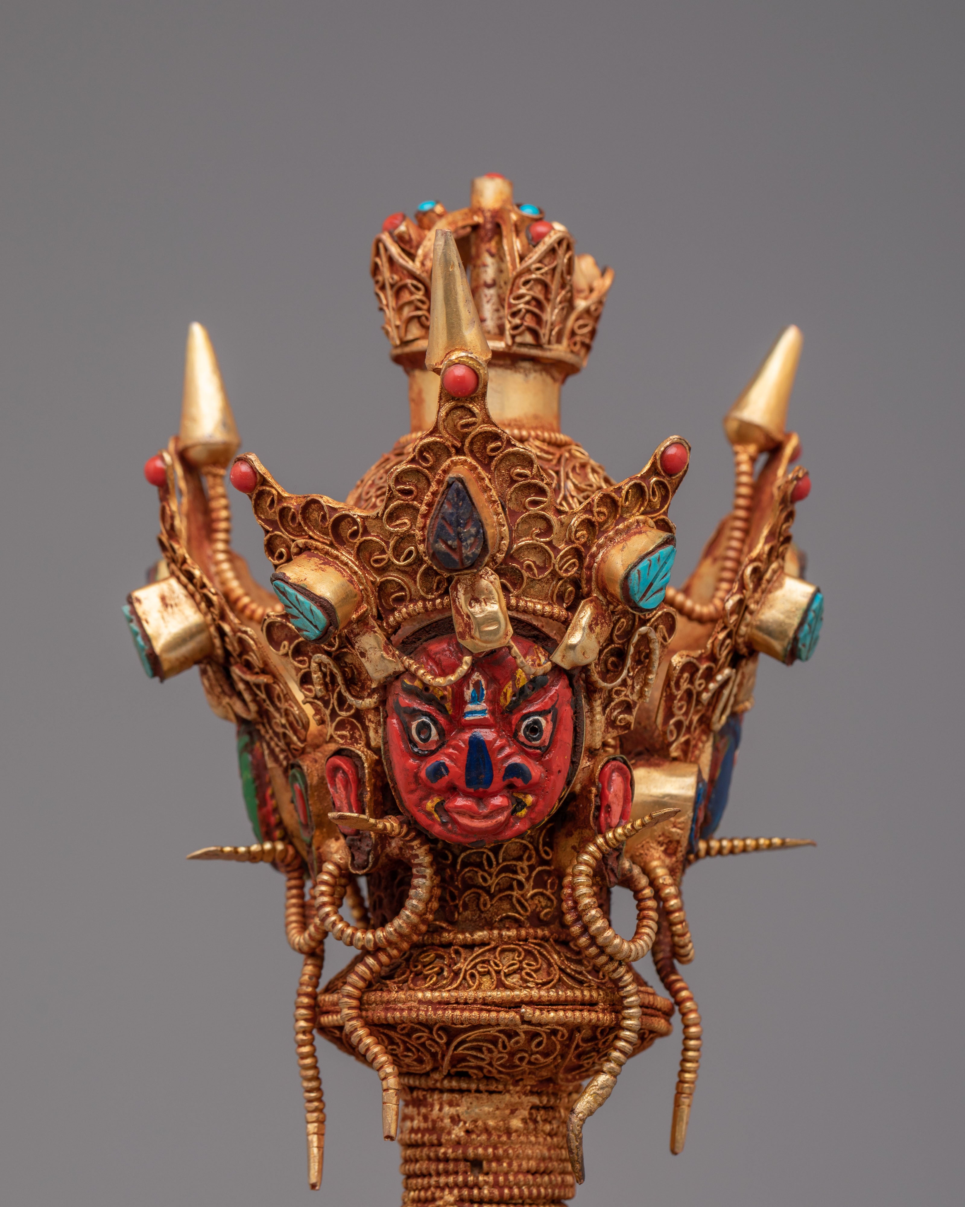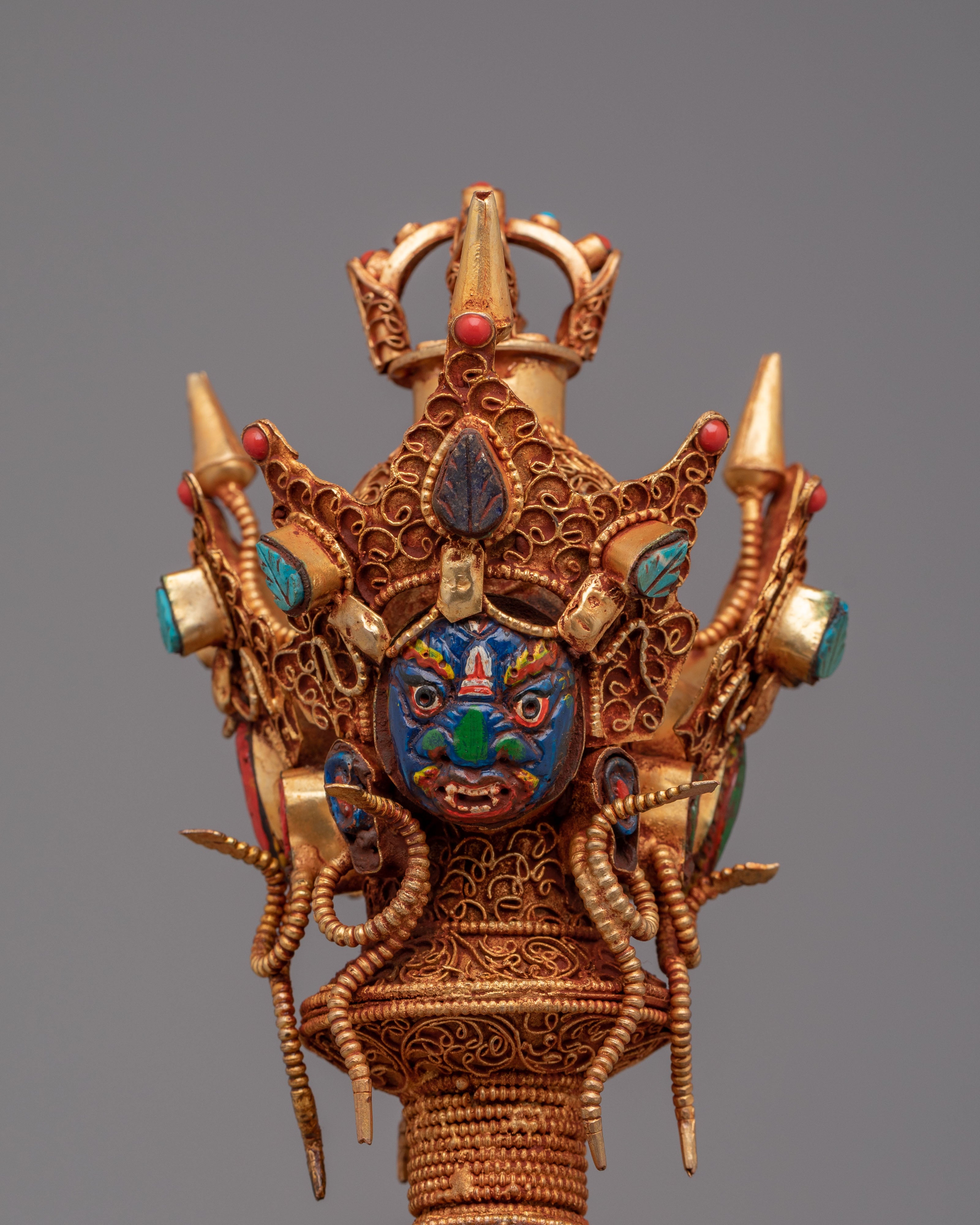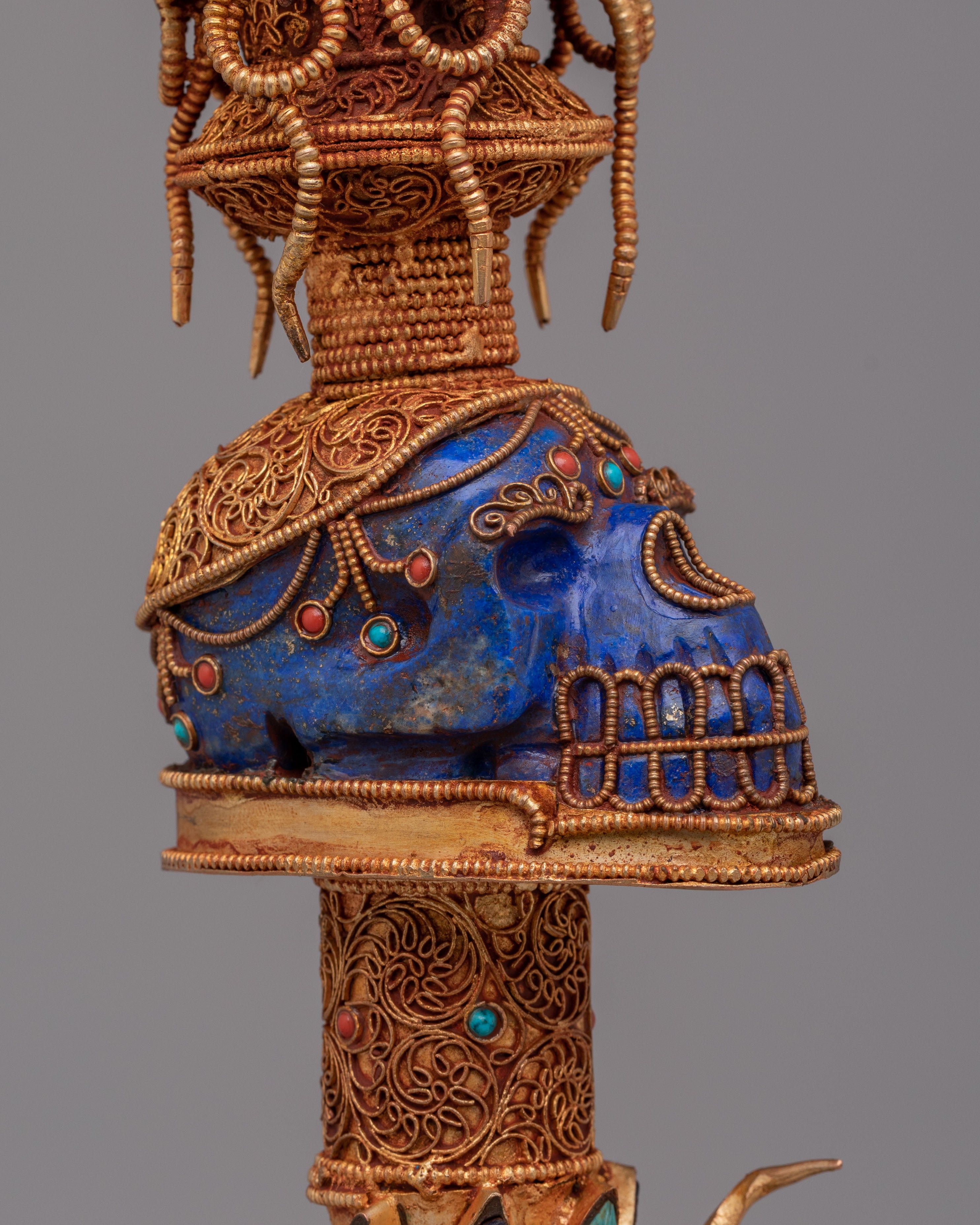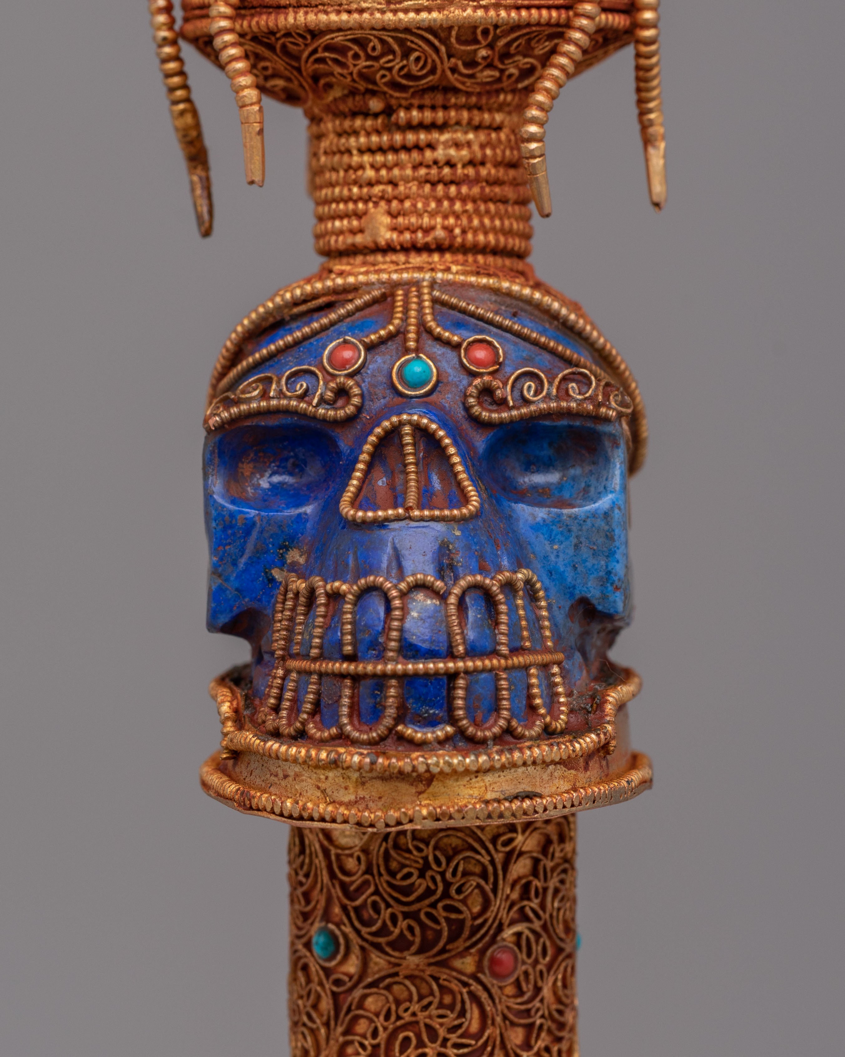 This phurba features a highly detailed structure, including a striking wrathful deity face at the top, representing strength and the power to overcome ignorance. The midsection is decorated with a skull motif, symbolizing impermanence and the transformation of ego, highlighted with deep lapis lazuli tones. The lower section is richly carved with layered patterns and inlaid turquoise and coral stones, adding both visual depth and symbolic meaning. Each section of the dagger reflects traditional Himalayan craftsmanship, combining artistic detail with spiritual purpose.