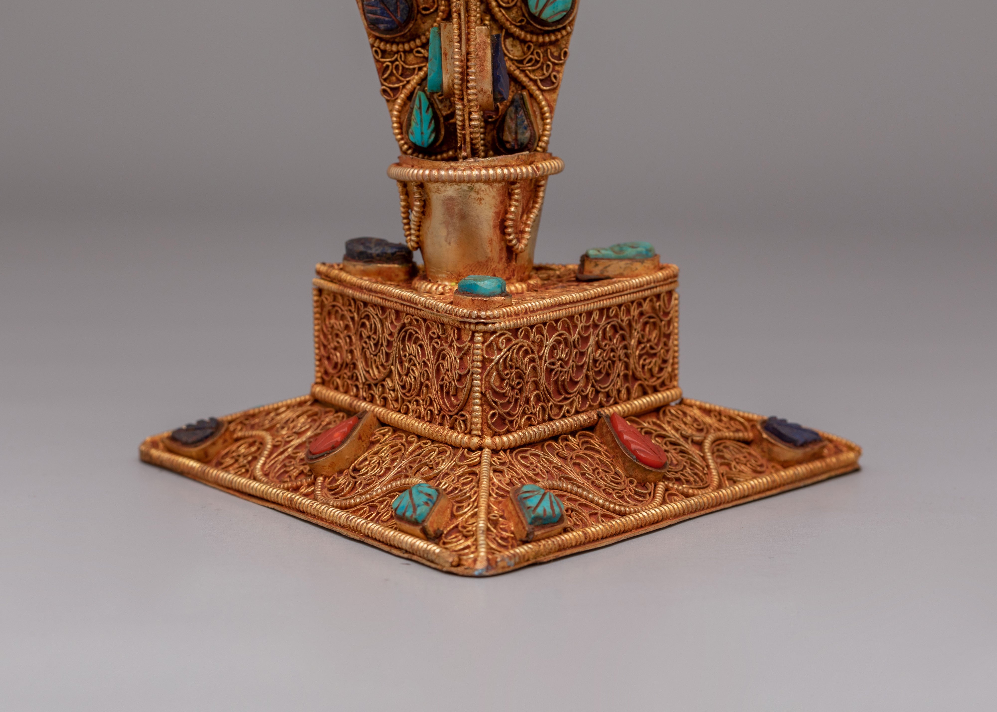 The Spiritual Phurba Ritual Dagger is a sacred Tibetan ritual object associated with Vajrakilaya, used for spiritual protection and transformation. Crafted from copper and adorned with coral, turquoise, and lapis lazuli, this intricately designed phurba embodies powerful symbolic meaning. Traditionally used in Buddhist rituals, the phurba is believed to subdue negative energies, remove obstacles, and stabilize spiritual forces, making it an essential tool for advanced practices and sacred spaces.