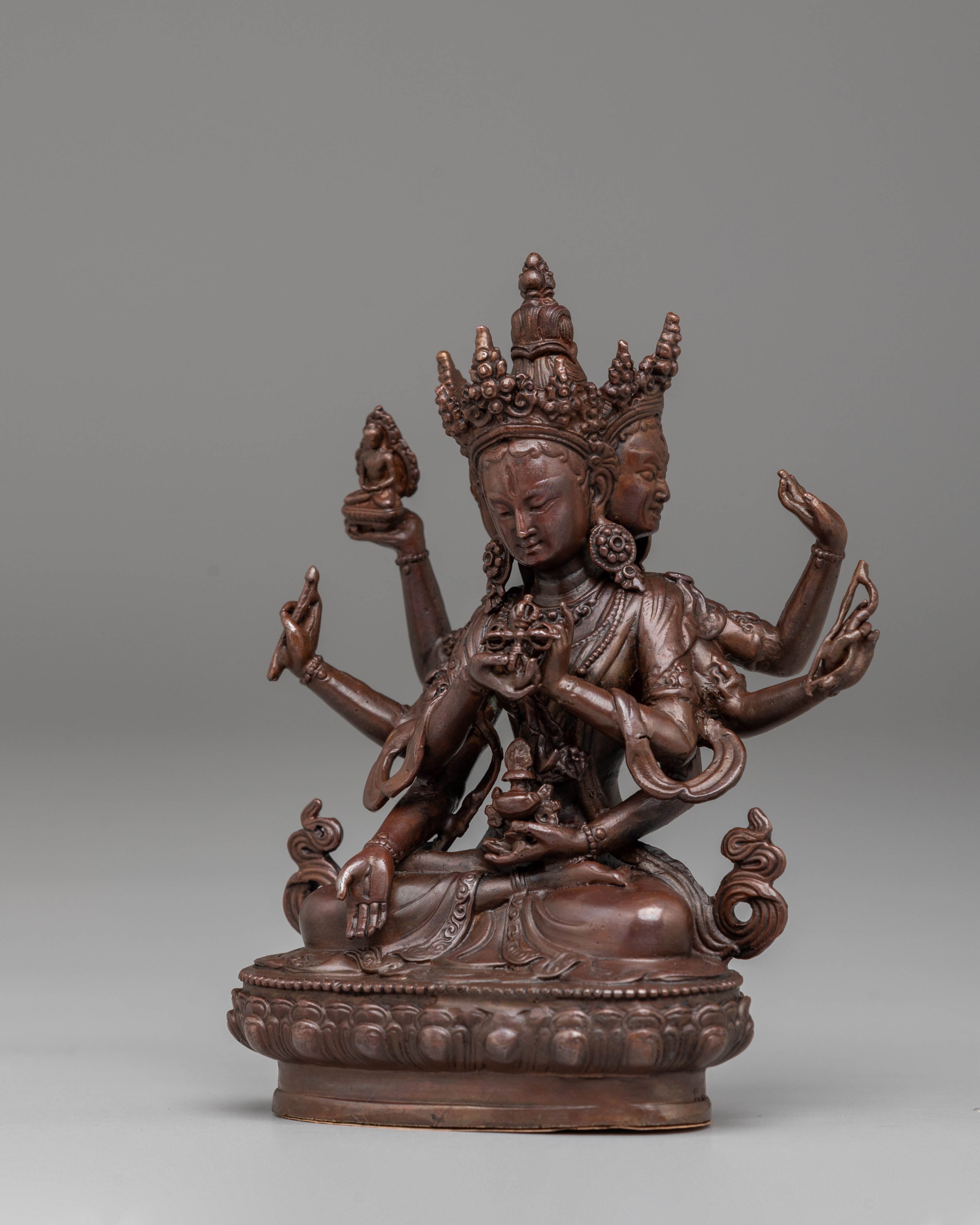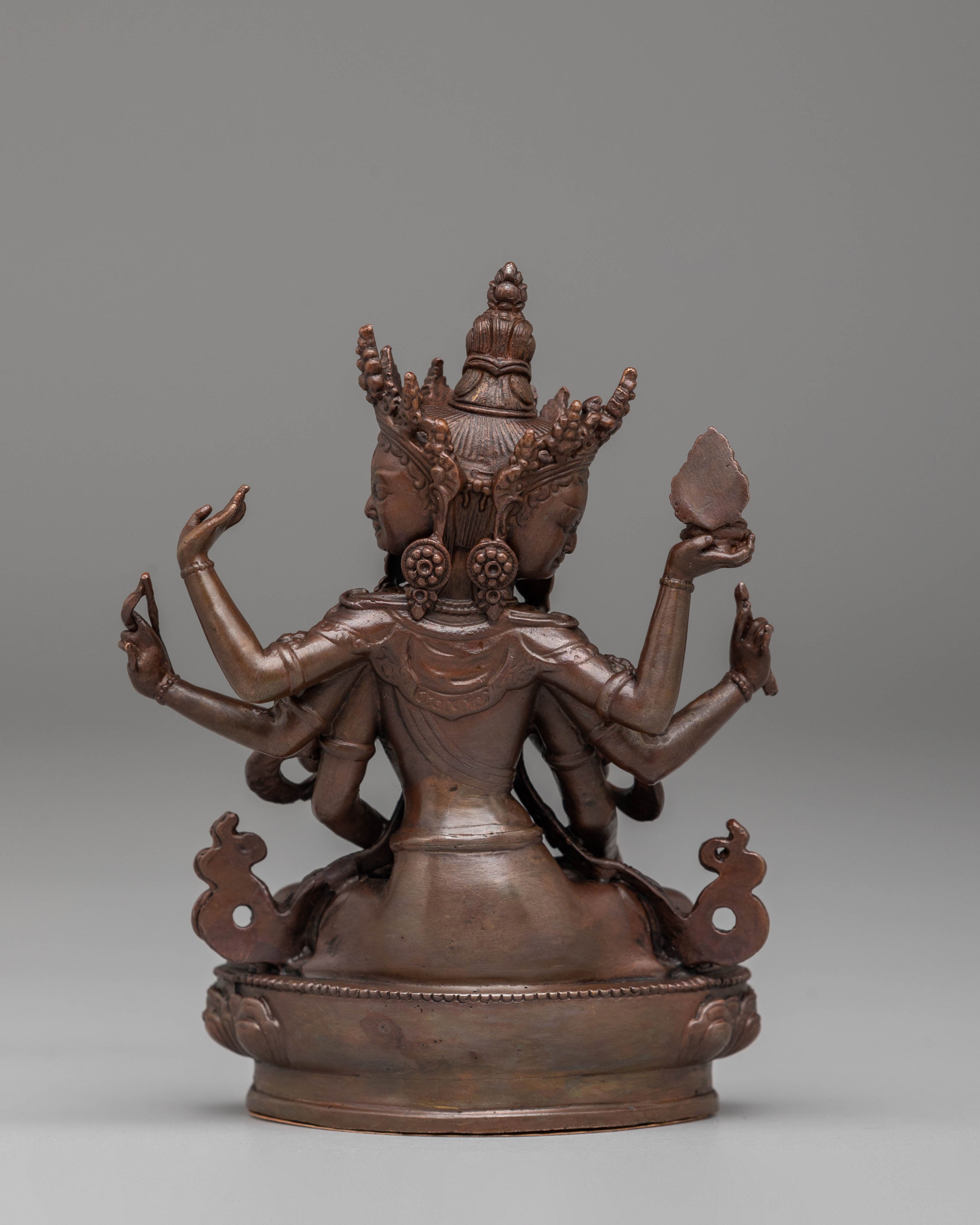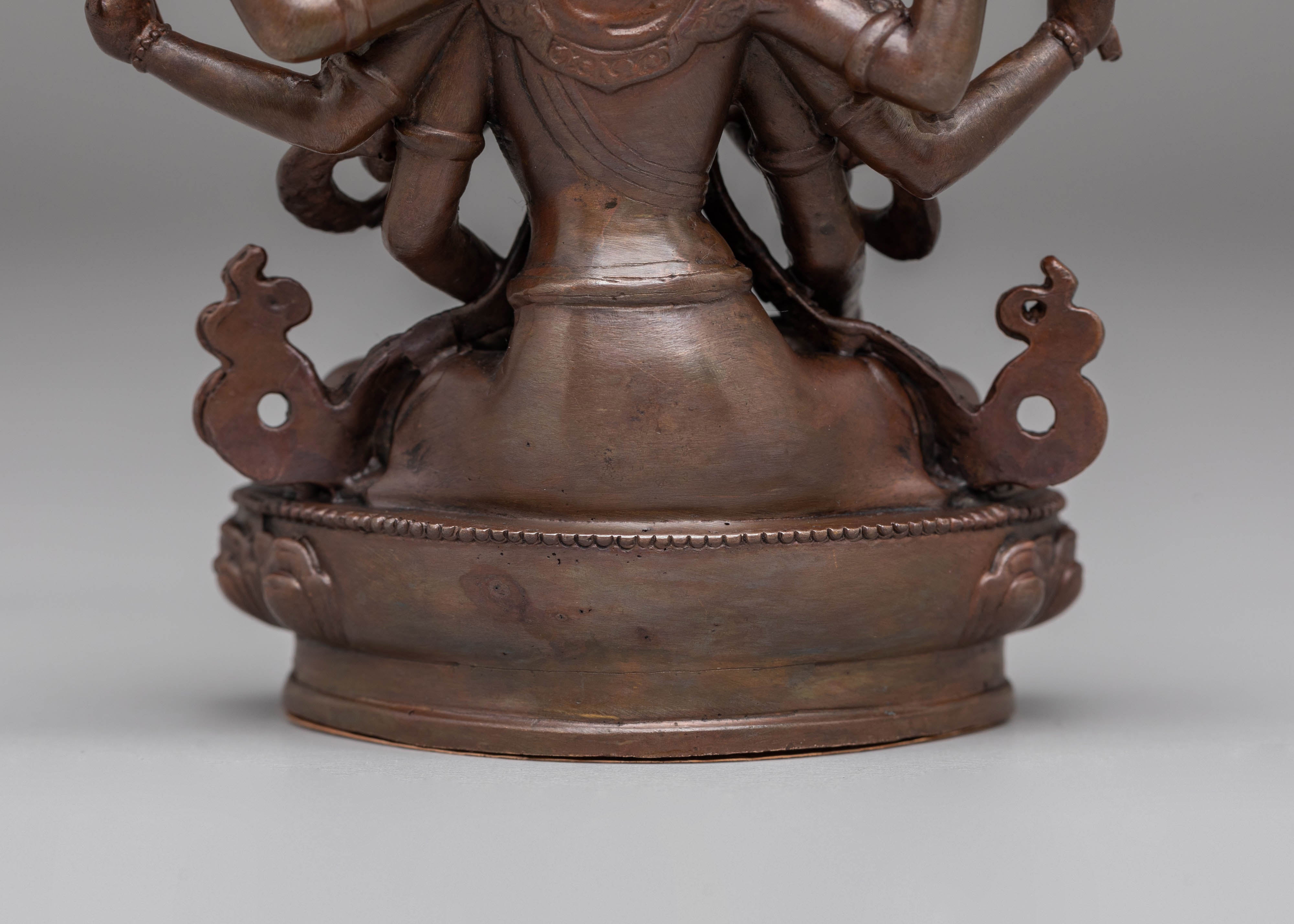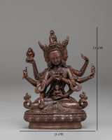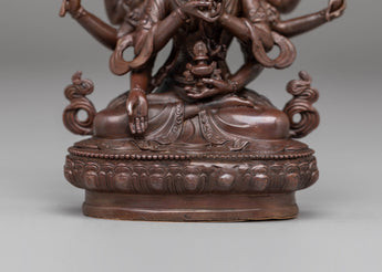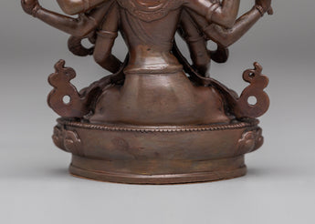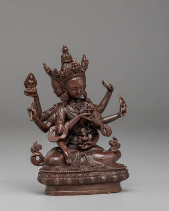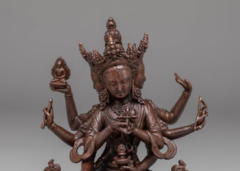 This handcrafted Namgyalma statue measures 11 cm in height and 9 cm in width, weighing 0.3 kg. Crafted from oxidized copper, it features a unique dark finish that enhances its traditional and spiritual appeal. The intricate detailing in Namgyalma's posture and facial expression reflects the skill of Nepalese artisans, making this statue a valuable addition to any Buddhist altar or meditation space.
