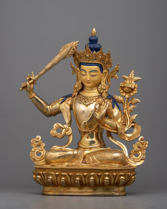 In Buddhist traditions, Manjushri is honored as the personification of transcendent wisdom. He bears a book of wisdom, signifying his understanding of Buddhist doctrine, and a fiery sword to strike through delusion. A statue of Manjushri in your home or office serves as a poignant reminder of how wisdom can light the way for us.