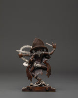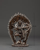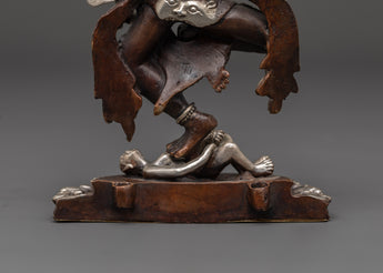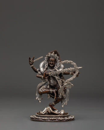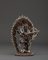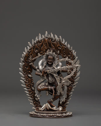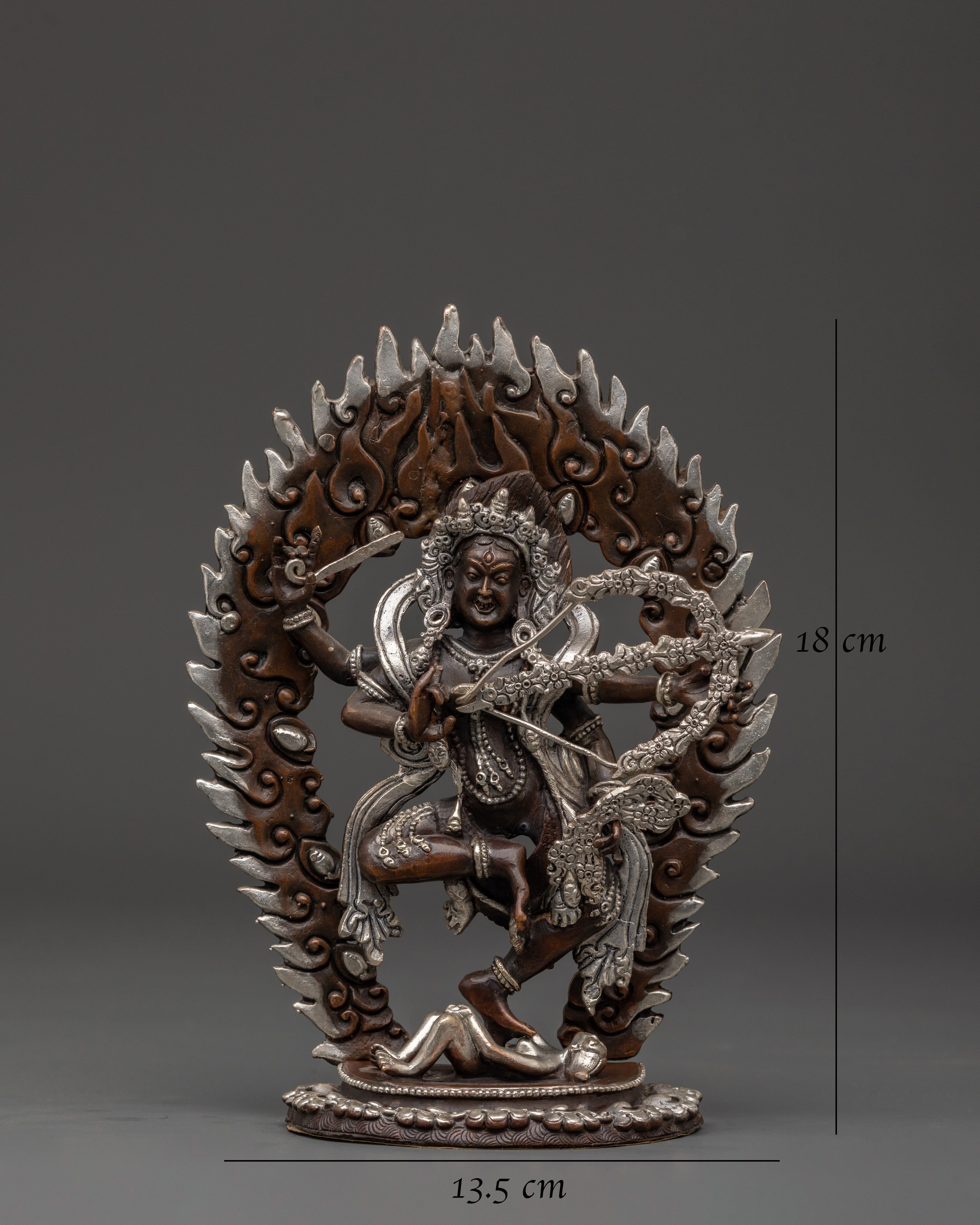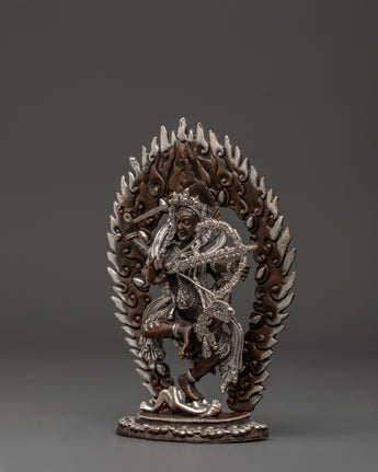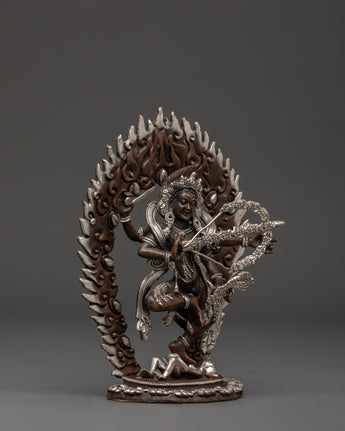The statue features Kurukulla, depicted in a dynamic, dance-like posture, representing her ability to harness the forces of attraction and desire for spiritual transformation. She is shown with a fierce yet graceful expression, holding a bow and arrow, symbolizing her power to control and direct energy. The silver plating on the statue adds a divine touch, enhancing its spiritual presence, while the oxidized copper body ensures durability and gives the statue a vintage, timeless feel. The intricate design of the flames surrounding her highlights her energy and the transformation she facilitates in the world.