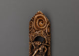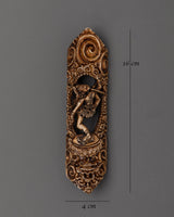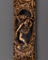 This Vajrayogini bone statue is 16 cm tall, 4 cm broad, and weighs 0.078 kg. It was carved from ethically sourced buffalo bone. This wonderfully sculpted figure represents Vajrayogini in a dynamic dance pose atop a lotus pedestal, surrounded by swirling filigree designs representing change and the mandala of enlightened energy. Every curve, from her uplifted arm gripping the ceremonial staff to the flowing skirt, shows amazing craftsmanship, making this item unique in any spiritual place.