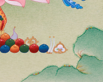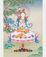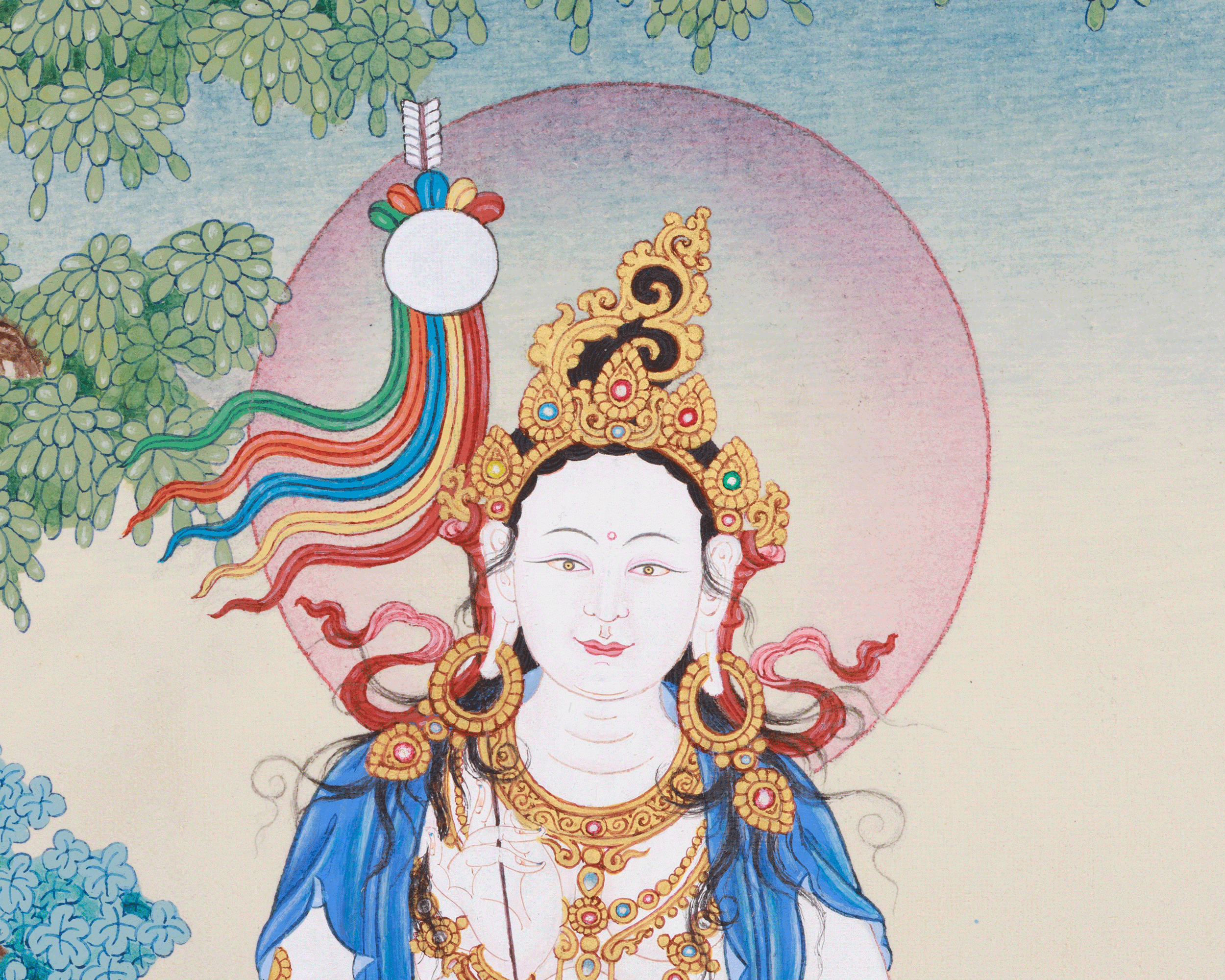 In this thangka, Mandarva is gracefully seated on a vibrant lotus throne, exuding purity, serenity, and transcendent beauty. Her glowing white body symbolizes clarity and awakened consciousness. At the same time, her gold ornaments and five-jeweled crown represent mastery over the five negative emotions, which have been transformed into the five wisdoms. She holds a vase filled with nectar, symbolizing healing and immortality, and a mirror that reflects perfect awareness of reality. Flowing ribbons of five-colored silk embody the harmony of enlightened wisdom. The peaceful, natural background, featuring lush trees, illustrates her connection to both earthly and celestial realms. The 3D stones and golden tones shimmer in the light, giving her presence a sacred vitality that feels almost alive, turning the thangka into a luminous expression of Mandarva’s divine energy.