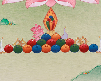 Illuminate your sacred space with this Rinpoche Consort Mandarva Thangka, a hand-painted masterpiece that beautifully blends tradition with innovation. Created on cotton canvas with natural stone pigments and genuine 24K gold, this artwork is enhanced with intricate 3D stone embellishments, setting it apart from typical artworks. The inlaid 3D stones add depth and brilliance, creating a lifelike, multidimensional effect that accentuates Mandarva’s jewelry, crown, and sacred ornaments with divine texture and luminosity. The warm glow of the 24K gold and natural pigments reflects exceptional workmanship and spiritual energy. Painted in the traditional Karma Gadri style, it embodies clarity and serenity while showcasing artistic finesse and devotion. Mandarva, the enlightened consort of Guru Padmasambhava, is a revered dakini who embodies both wisdom and compassion.